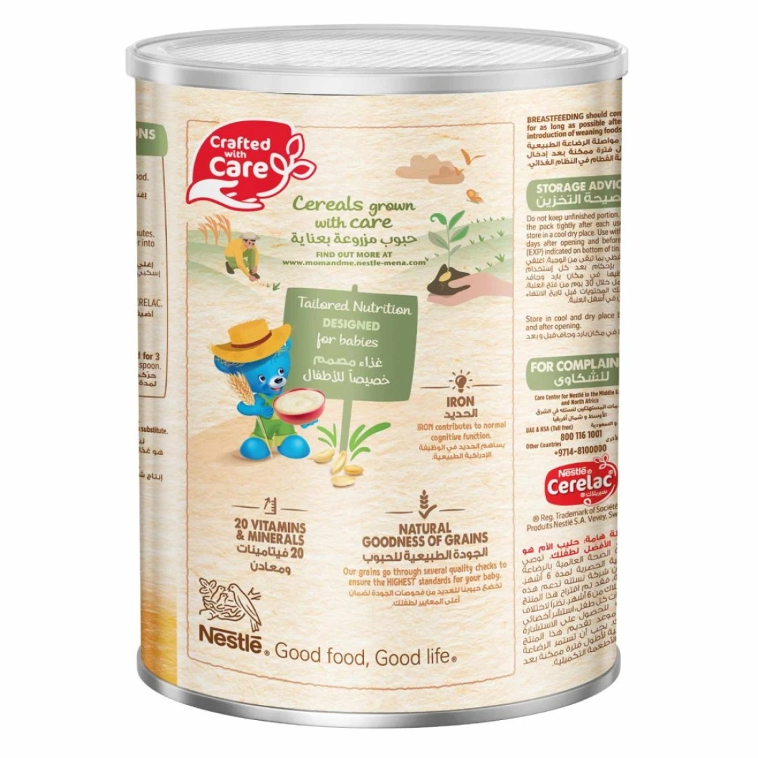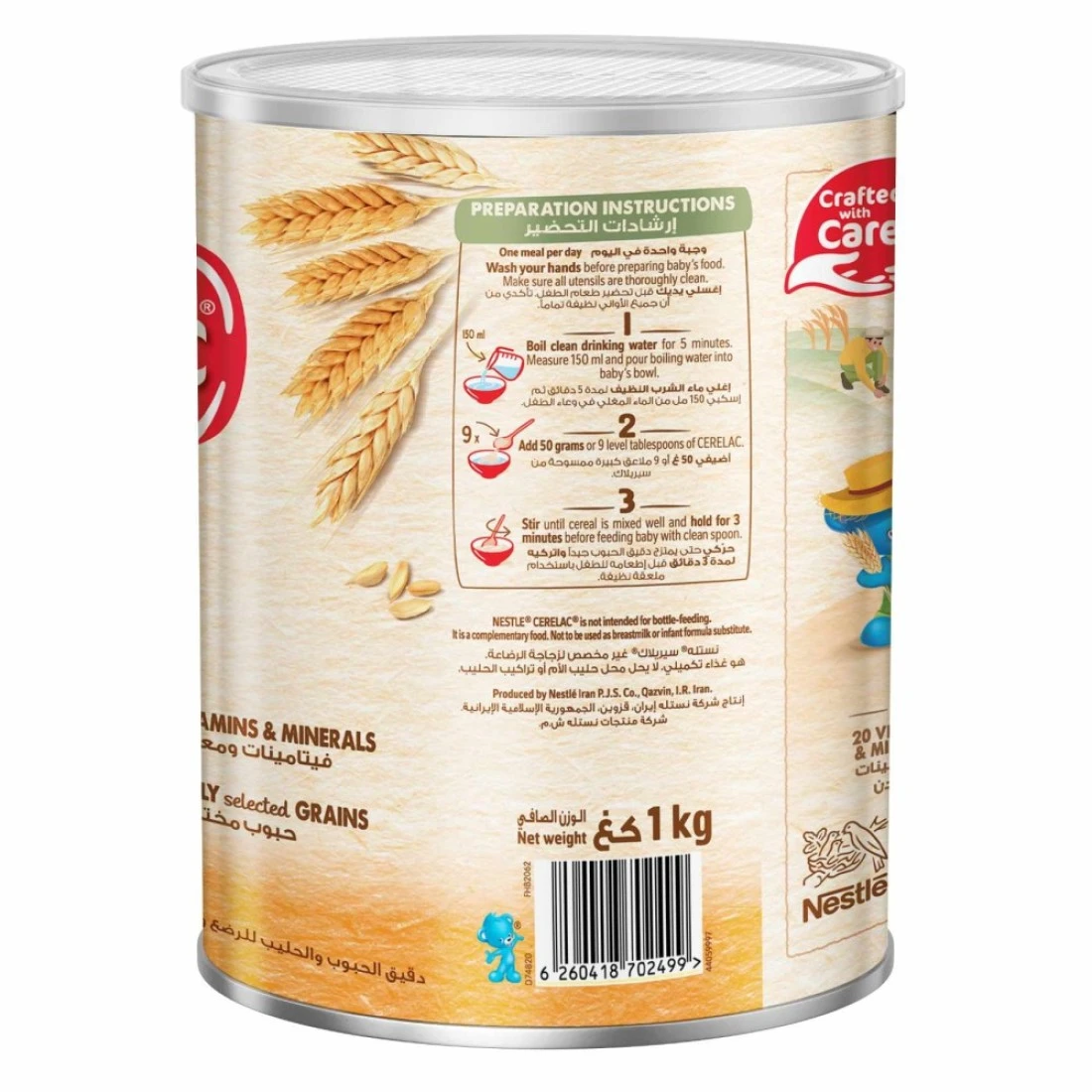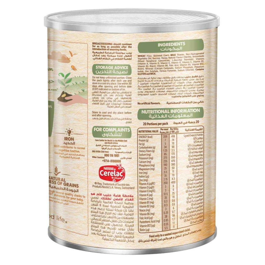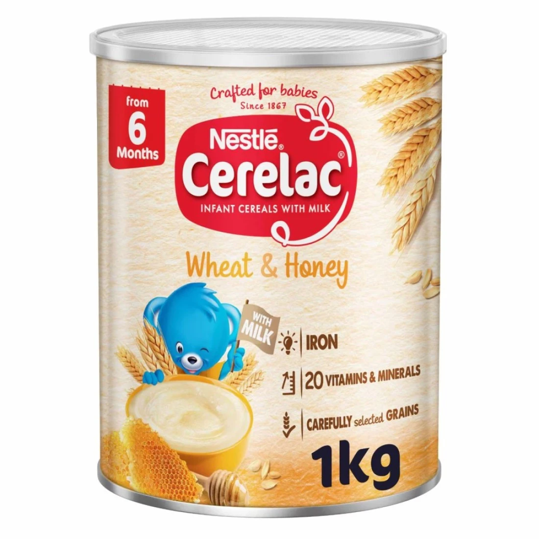 حبوب سيريلاك نستله للأطفال بالقمح والعسل مع الحليب مُدعّم بـ 16 فيتامينًا ومعادن (بما في ذلك الحديد والكالسيوم وفيتامين د). مُحضّرة من حبوب مختارة بعناية، ولا تحتوي على مواد حافظة أو ألوان أو نكهات صناعية. تغذية مُخصصة للأطفال من عمر 6 أشهر فما فوق.