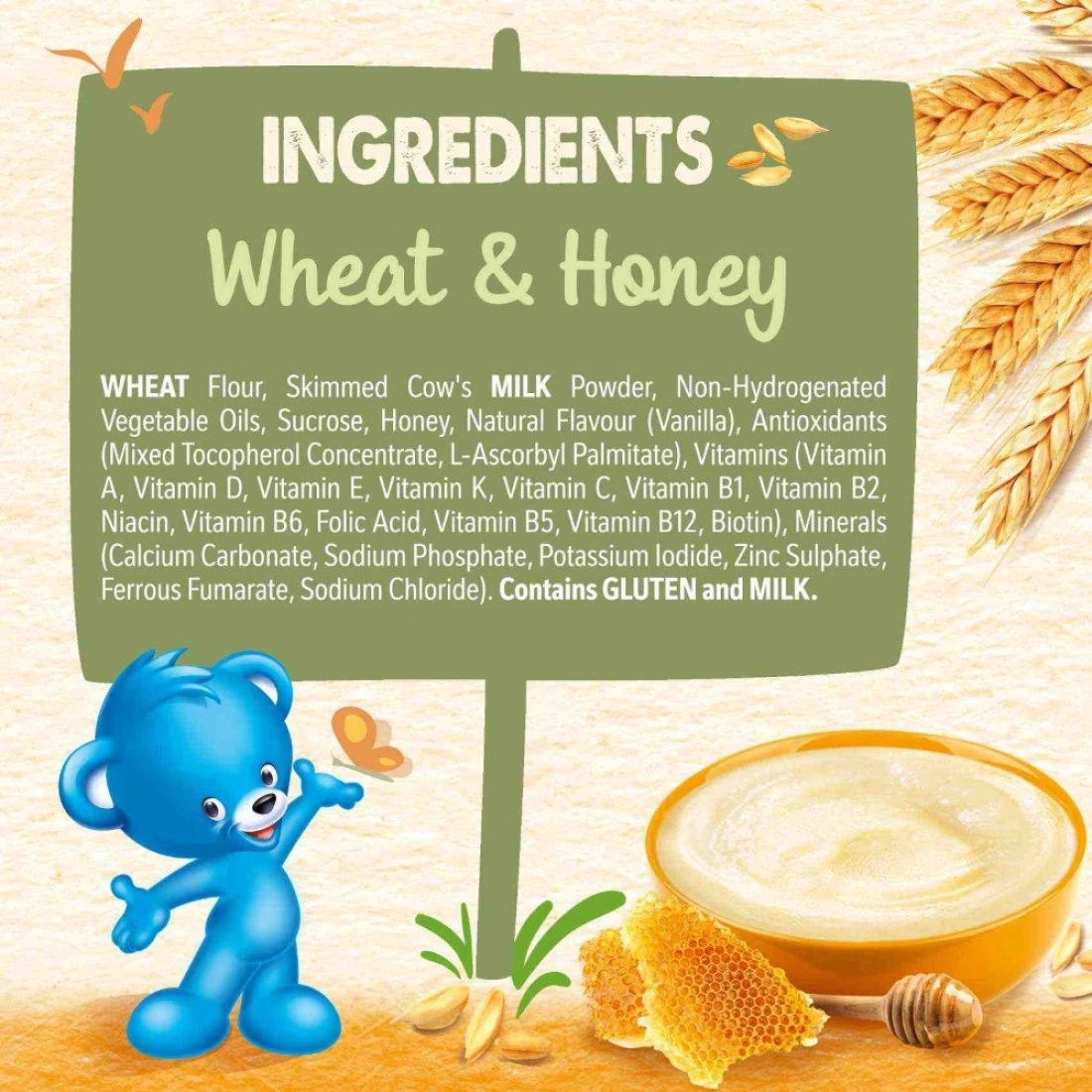 ingredients : دقيق القمح، حليب بقر مجفف منزوع الدسم، زيوت نباتية غير مهدرجة، عسل، سكروز، نكهة طبيعية (فانيليا)، فيتامينات (فيتامين ج، نياسين، فيتامين هـ، فيتامين ب1، حمض البانتوثينيك، فيتامين أ، فيتامين ب6، فيتامين ك، حمض الفوليك، بيوتين، فيتامين د)، معادن (فومارات الحديدوز، كربونات الكالسيوم، كبريتات الزنك، يوديد البوتاسيوم)