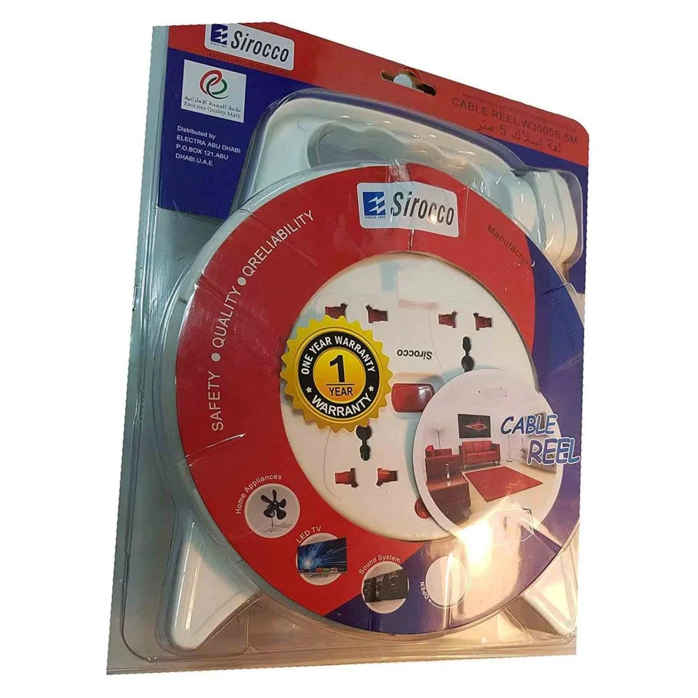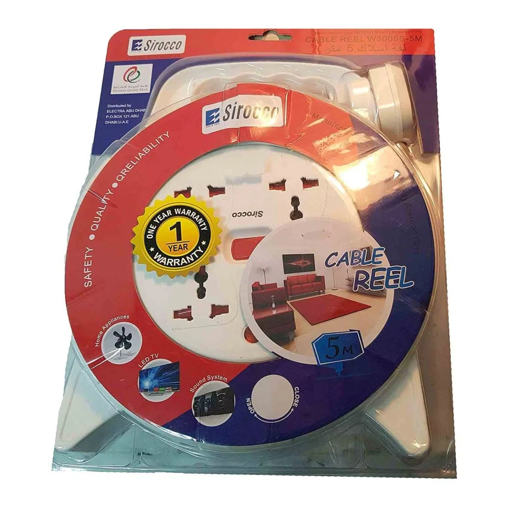 سيروكو بكرة كابل بأربعة اتجاهات ، مقبس تمديد طاقة W3005، أبيض، 5 متر