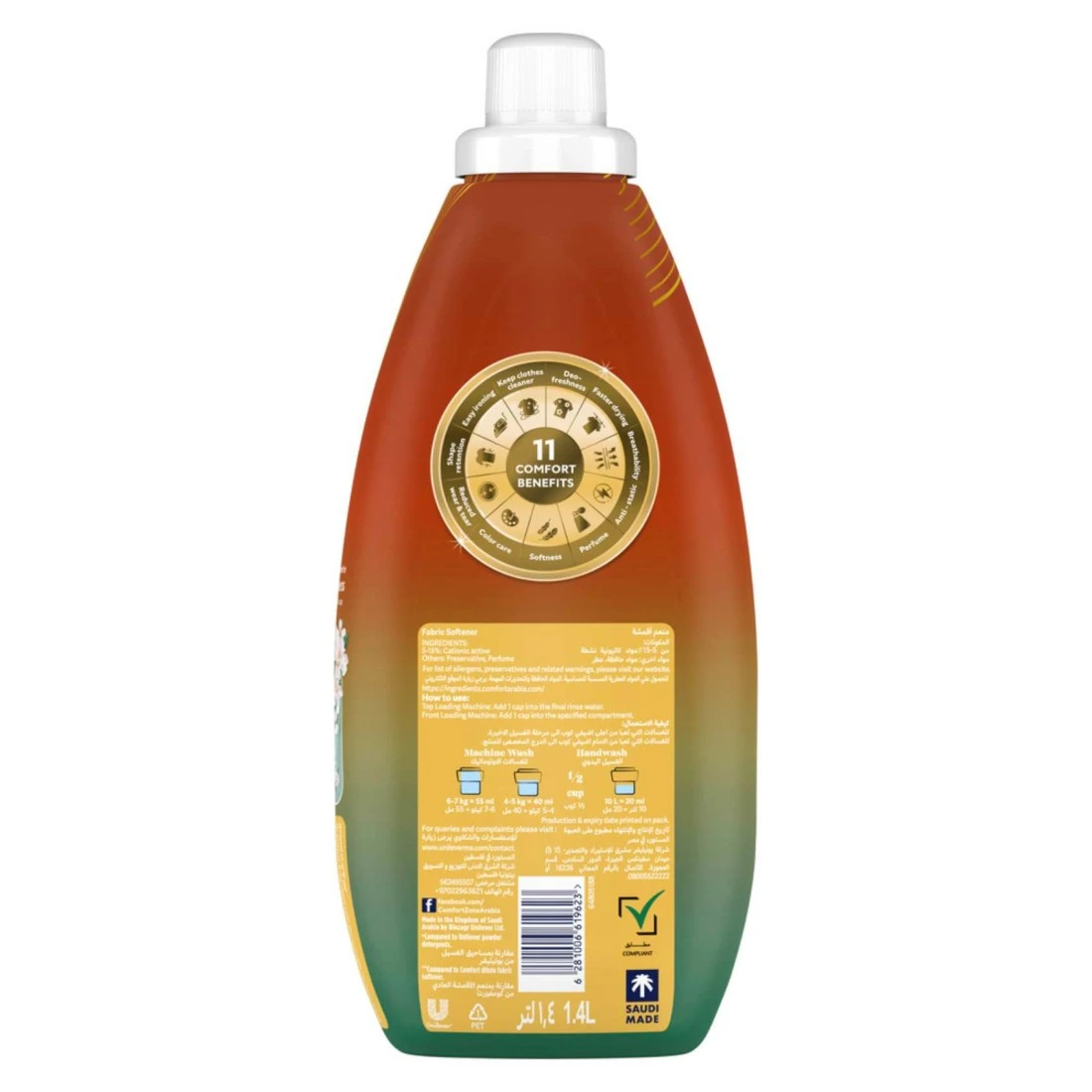 حوّلوا روتين الغسيل الخاص بكم مع منعم الأقمشة الجديد كومفورت، الذي يتميز بمزيج منعش من عطر ليلي مسك والكراميل، ليمنح ملابسكم إحساسًا منعشًا ورائحة شهية تدوم طويلاً. استمتعوا برائحة تدوم حتى ٩ مرات أكثر*، لتحافظ على انتعاش ملابسكم طوال اليوم. كما توفر تركيبة كومفورت المتقدمة حماية فائقة للألوان، لتبقى ألوان ملابسكم المفضلة نابضة بالحياة مع كل غسلة. بالإضافة إلى ذلك، تمنح ملابسكم نعومة فائقة** لا تُقاوم.مع ١١ فائدة مذهلة، يرتقي منعم الأقمشة كومفورت بالعناية بالأقمشة إلى مستوى جديد. فهو يجعل الكي أسهل، ويسرع من عملية التجفيف، ويقلل استخدام الكهرباء الساكنة، ويحافظ على انتعاش الملابس. تضيف تركيبته الفريدة لمسة ناعمة وسلسة مع تقليل التآكل، مما يساعد على احتفاظ ملابسكم بشكلها ومظهرها لفترة أطول. كل غسلة تجعل ملابسكم منتعشة، متجددة، ومريحة للارتداء.استخدام منعم الأقمشة كومفورت بسيط وسهل. في الغسالات العلوية، أضيفوا غطاءً واحدًا في ماء الشطف الأخير. وفي الغسالات الأمامية، صبوا غطاءً واحدًا في المكان المخصص لذلك. مع كل غسلة، يضمن لكم منعم الأقمشة كومفورت ملابس منعشة تمامًا، ناعمة بشكل لا يُقاوم، ومحافظة على عنايتها.أضيفوا منعم الأقمشة كومفورت إلى روتينكم اليومي واستمتعوا بغسيل ذي رائحة رائعة، ملمس ناعم، وعناية تدوم طويلاً لتعزيز عمر خزانة ملابسكم.كومفورت يعتني بالملابس منذ أكثر من ٥٠ عامًا. استكشفوا المجموعة الكاملة!*مقارنة بمنظفات البودرة من يونيليفر**مقارنة بمنعم الأقمشة كومفورت المخفف