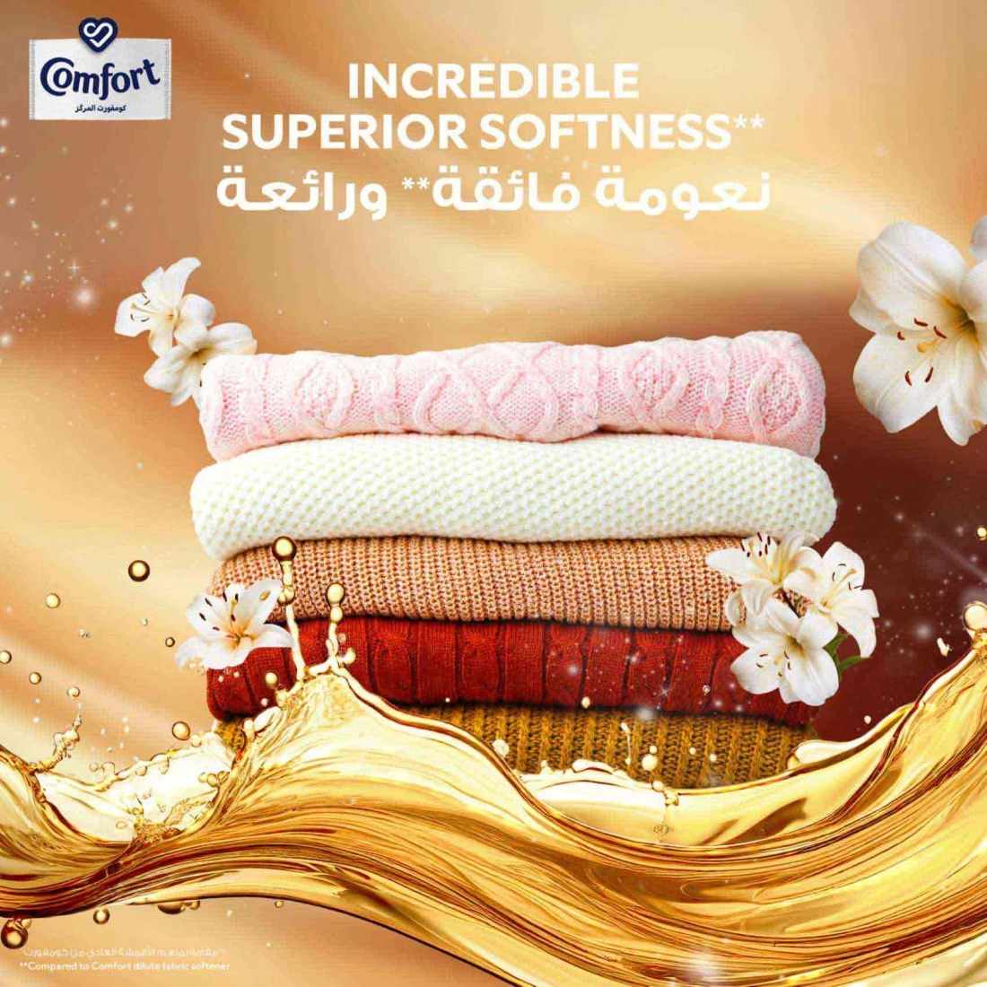 - نعومة فائقة**: جربوا الفرق الرائع مع منعم الأقمشة كومفورت الذي يمنح ملابسكم نعومة فائقة** بعد كل غسلة.