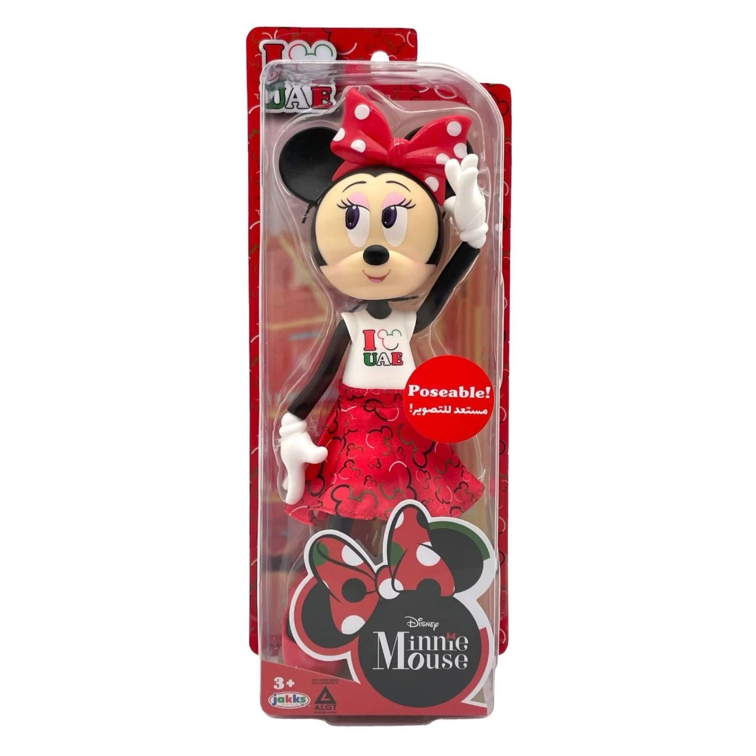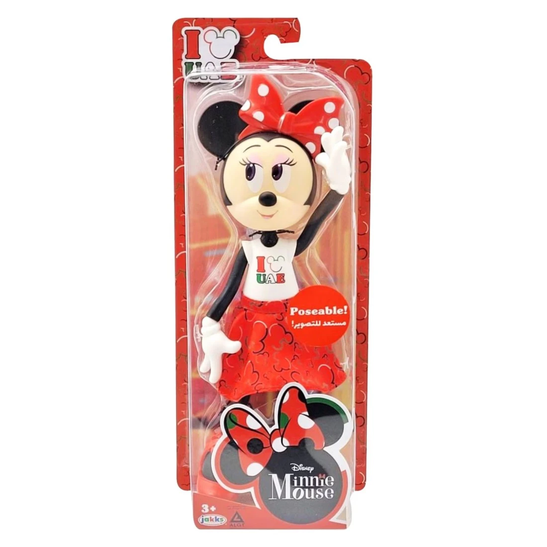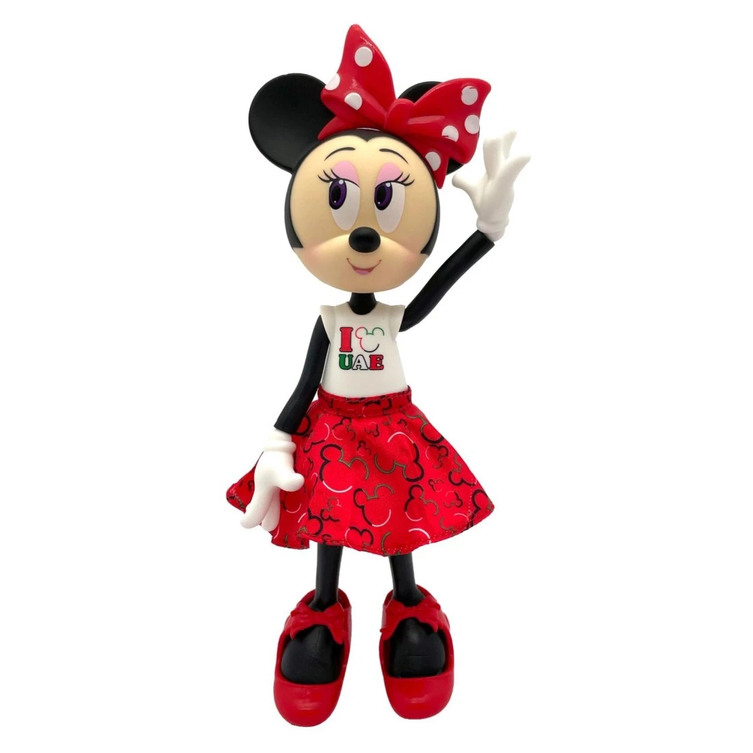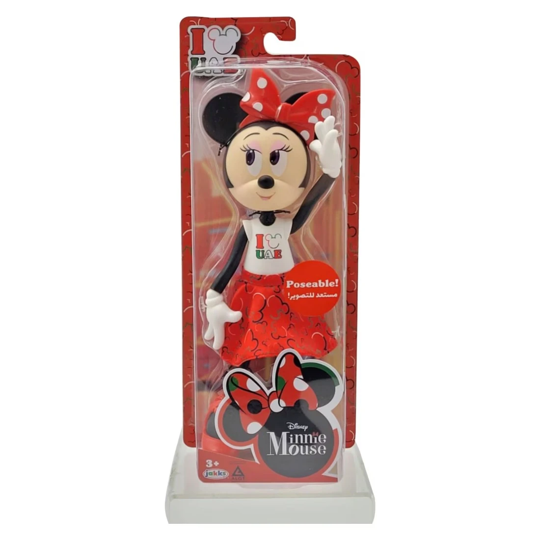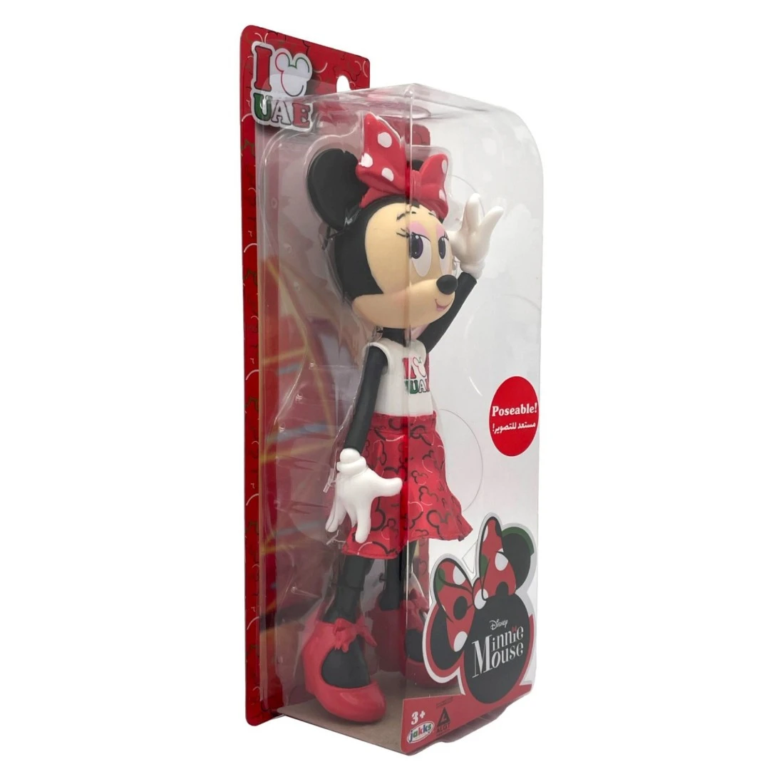 - يمكن لهاته الدمية القابلة للتحريك الوقوف بمفردها عند إرتدائها لحذائها وتتميز بمفاصل تتحرك في العنق والكتفين والمعصمين والوركين والمعصمين لتستطيع إعتماد وقفات مختلفة بثقة ويمكن نزع يديها بسهولة لتغيير ملابسها! ترتدي دمية ميني ماوس زيا أحمرا وأبيضا مع عبارة أنا أحب الإمارات