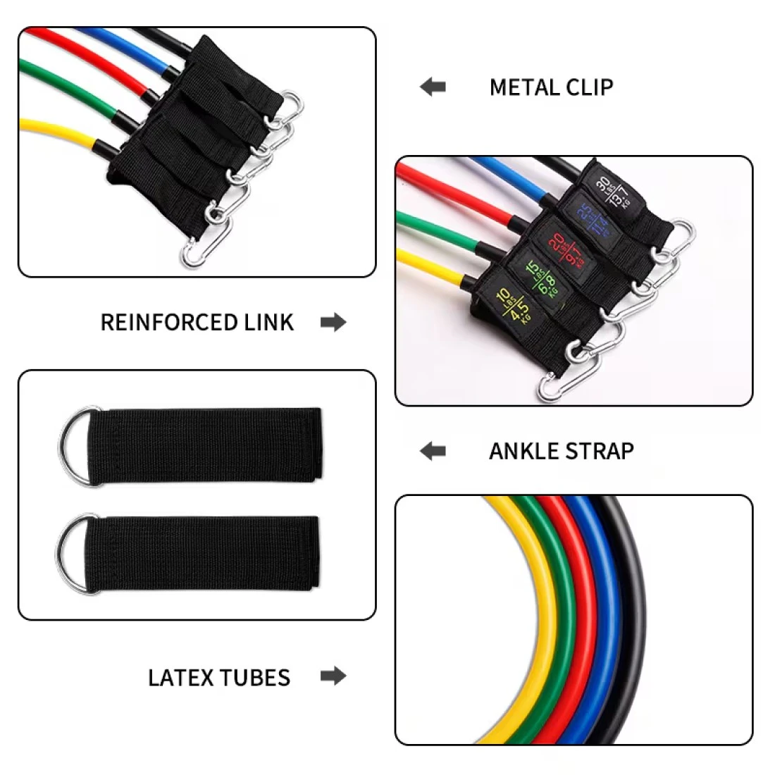 مستويات المقاومة القابلة للتعديل: يختلف كل شريط في الألوان ومستويات المقاومة: الأصفر - 10 أرطال ، والأزرق - 15 رطلاً ، والأحمر - 20 رطلاً ، والأخضر - 25 رطلاً ، والأسود - 30 رطلاً ، ويبلغ وزن المقاومة الإجمالي 75 رطلاً. يمكنك ضبط شدة التوتر لتحقيق أهدافك الشخصية من خلال تطبيق فرقة واحدة أو الجمع بين نطاقات متعددة ، مما يجعلها مثالية للمبتدئين أو المحترفين ، والرجال والنساء والمراهقين والأطفال