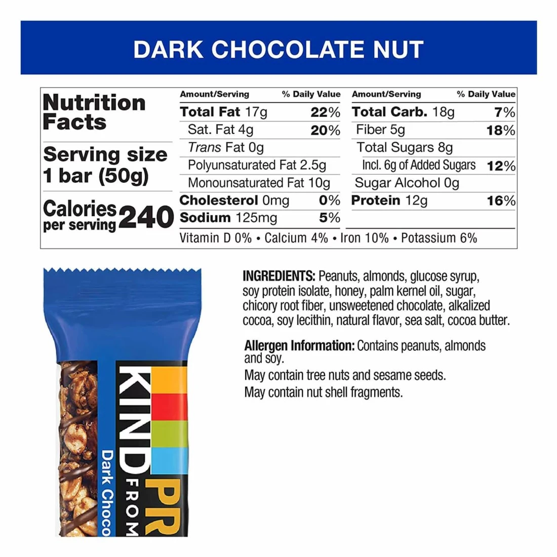 ingredients : الفول السوداني ، اللوز ، مغطى برائحة الشوكولاته الداكنة ، زيت بذور النخيل ، ألياف جذر اللوز ، السكر ، الكاكاو القلوي
