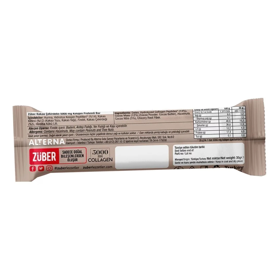 ingredients : التمر، ببتيدات الكولاجين المتحللة (14%)، كتلة الكاكاو (12%) (مسحوق الكاكاو، زبدة الكاكاو)، البندق، حبيبات الكاكاو (5%)، ألياف جذر الهندباء البرية