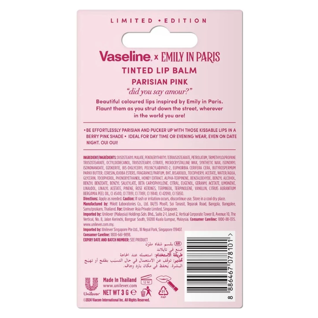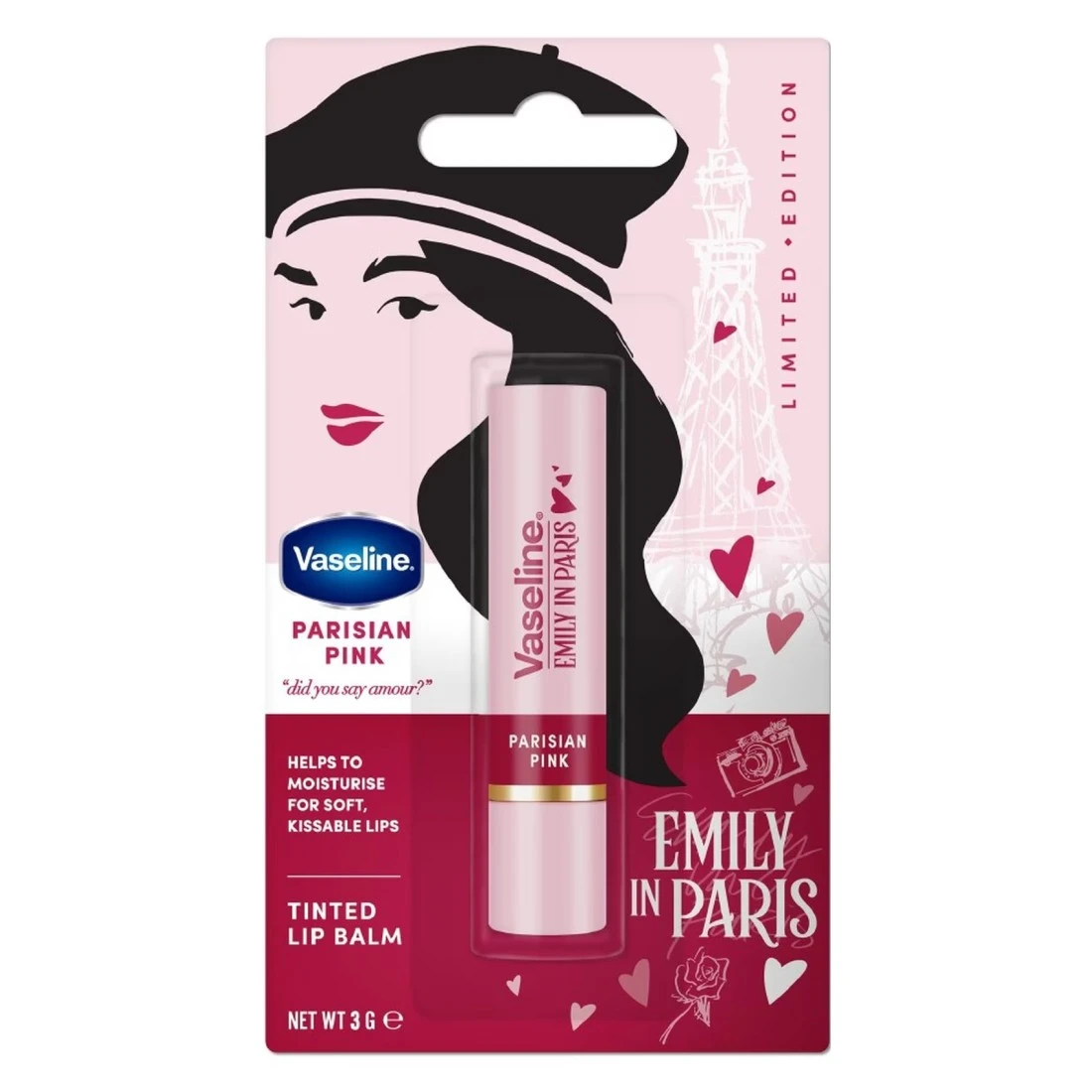 مرطب الشفاه الملون من فازلين إميلي في باريس ليمتد إديشن هو منتج أنيق وعصري للعناية بالشفاه مستوحى من المسلسل المحبوب على نتفلكس، يوفر هذا المرطب 3 غرام لونًا خفيفًا يعزز شفتيك مع توفير الفوائد المغذية لتركيبة الفازلين الكلاسيكية من فازلين، مثالي لتحقيق هذا المظهر الساحر دون عناء، فهو يرطب ويحمي شفتيك، مما يجعلها ناعمة وسلسة.،معبأ في حاوية مصممة بشكل جميل تعكس جوهر الأناقة الباريسية، يعد مرطب الشفاه الملون هذا إكسسوارًا لا غنى عنه لمحبي التباهي وأي شخص يتطلع إلى إضافة لمسة من الرقي إلى روتين جماله.