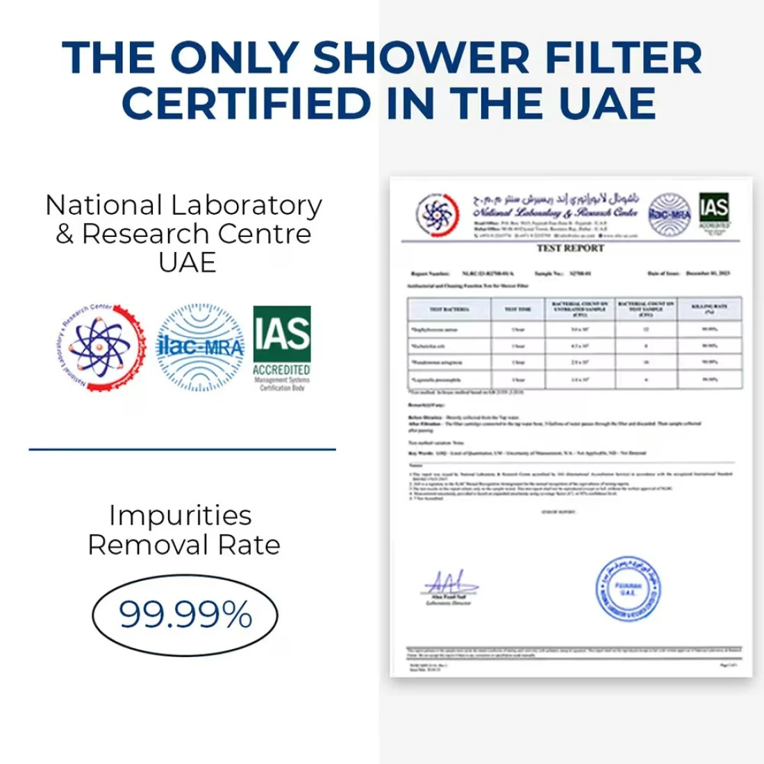 Is it laboratory tested? The only shower filter certified by National Laboratory & Research Centre UAE with 99.99% impurities removal rate.