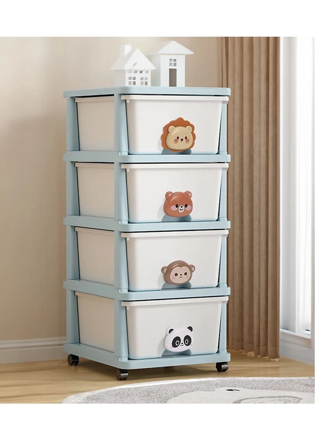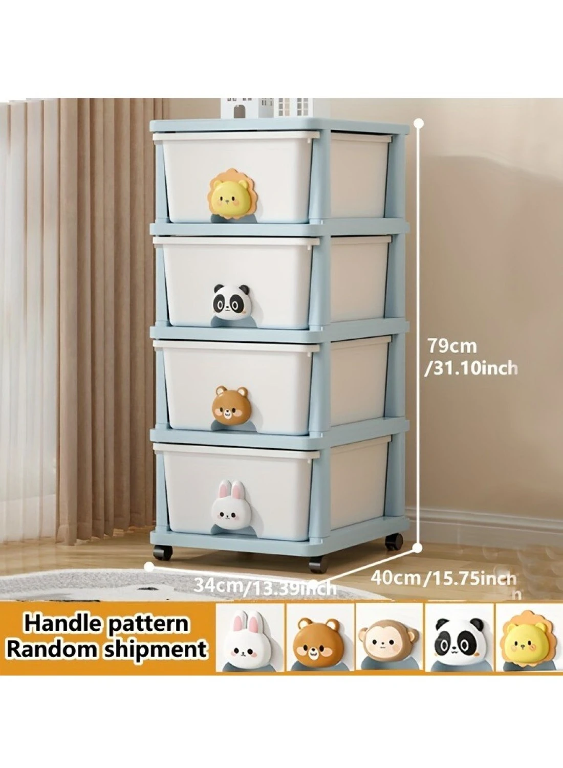 Item Weight: 4.6 Kilograms, Size: 4-Drawer Cabinet (L34, W40, H79) , Color: Blue and White, Material: Plastic, Item Package Quantity: 1, Included components 4-layer Children's Toy Plastic Rolling Drawer and 4 Wheels