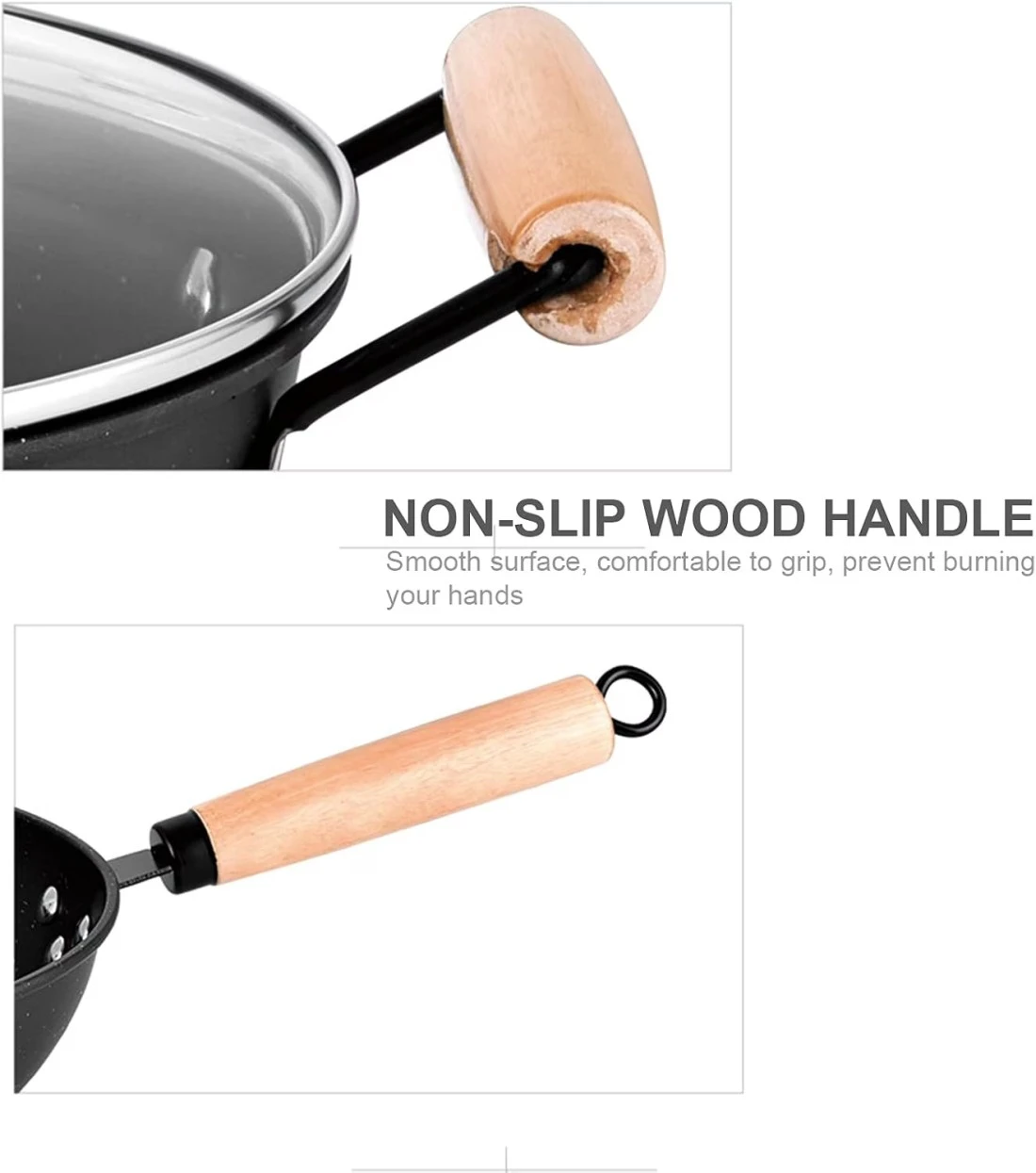 Specially constructed nonstick base avoids heat spots and distributes heat evenly, saving energy. With a long wooden handle, smooth surface, comfortable to grip, prevent burning your hands. Convenient to cook all types of meals for the family. Suitable for Induction, gas furnace, halogen oven, furnaces Visual lid design, you can observe the cooking process in the saucepan at any time. The handles of the Wok & Frying Pan have a hanging loop for convenient storage when not in use. A great gift for your family and friends. Healthy and non-sticky, easy to turn over without fried egg