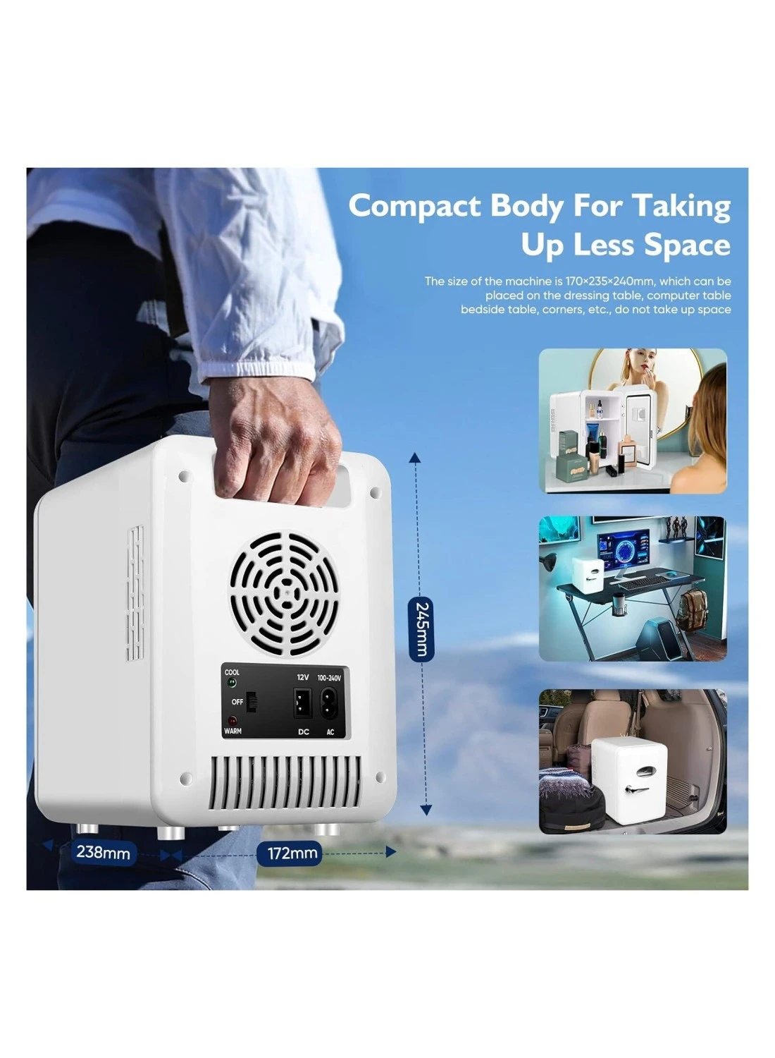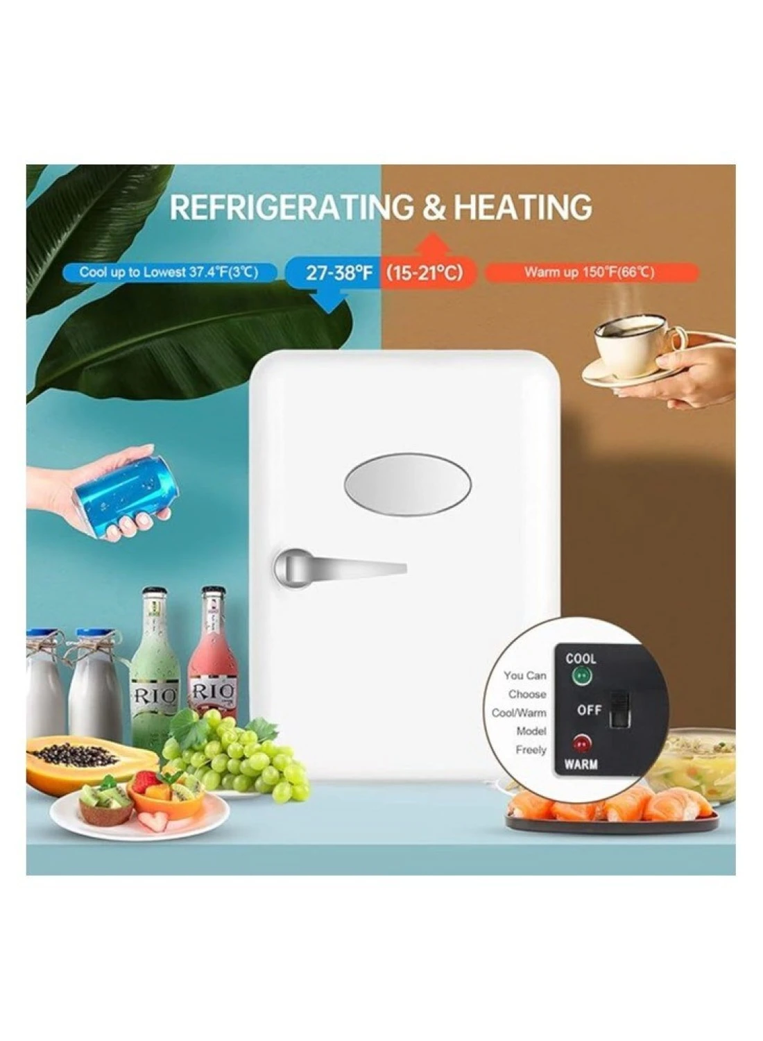 6-can capacity, this mini fridge offers ample storage space without occupying much room. Its thermoelectric technology allows you to easily switch between cooling and warming modes, ensuring your items are always at the perfect temperature.