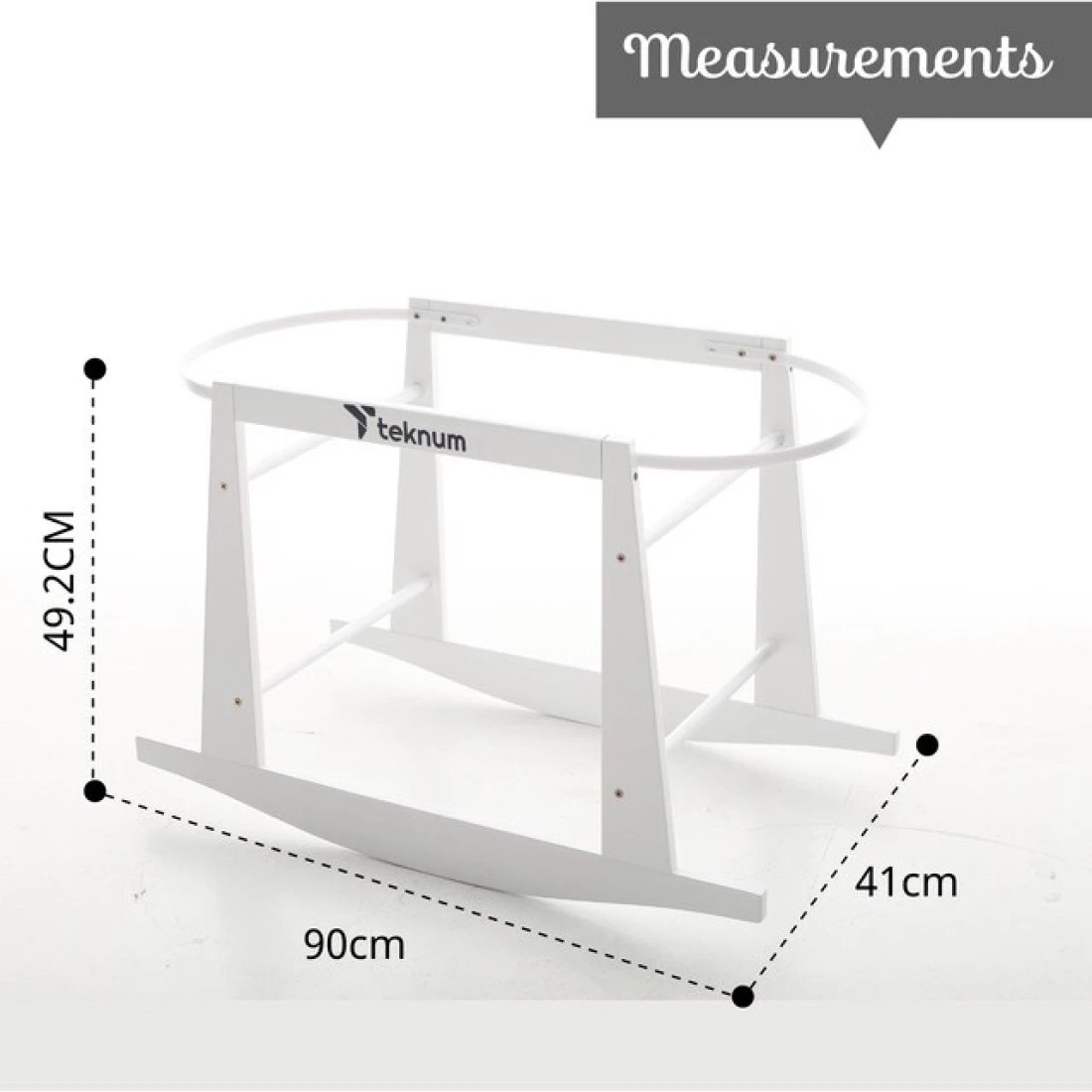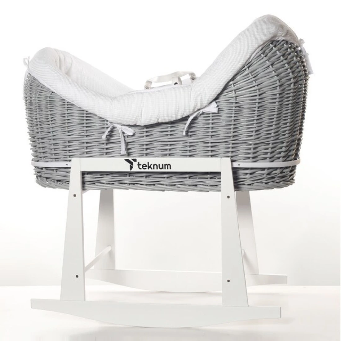 Teknum Infant Wicker Pod Moses Basket with White Waffle Beddings & White Rocker Stand - Wooden Grey