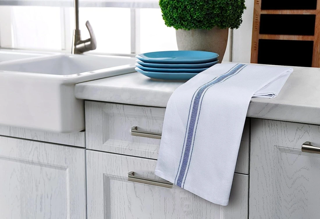 ✅ STRONG AND LONG-LASTING MATERIAL- Made from 100% ring spun cotton, the dish towels are durable and firm enough to withstand repeated uses and washings. The towels have a side stripe design that makes them look decent and elegant.