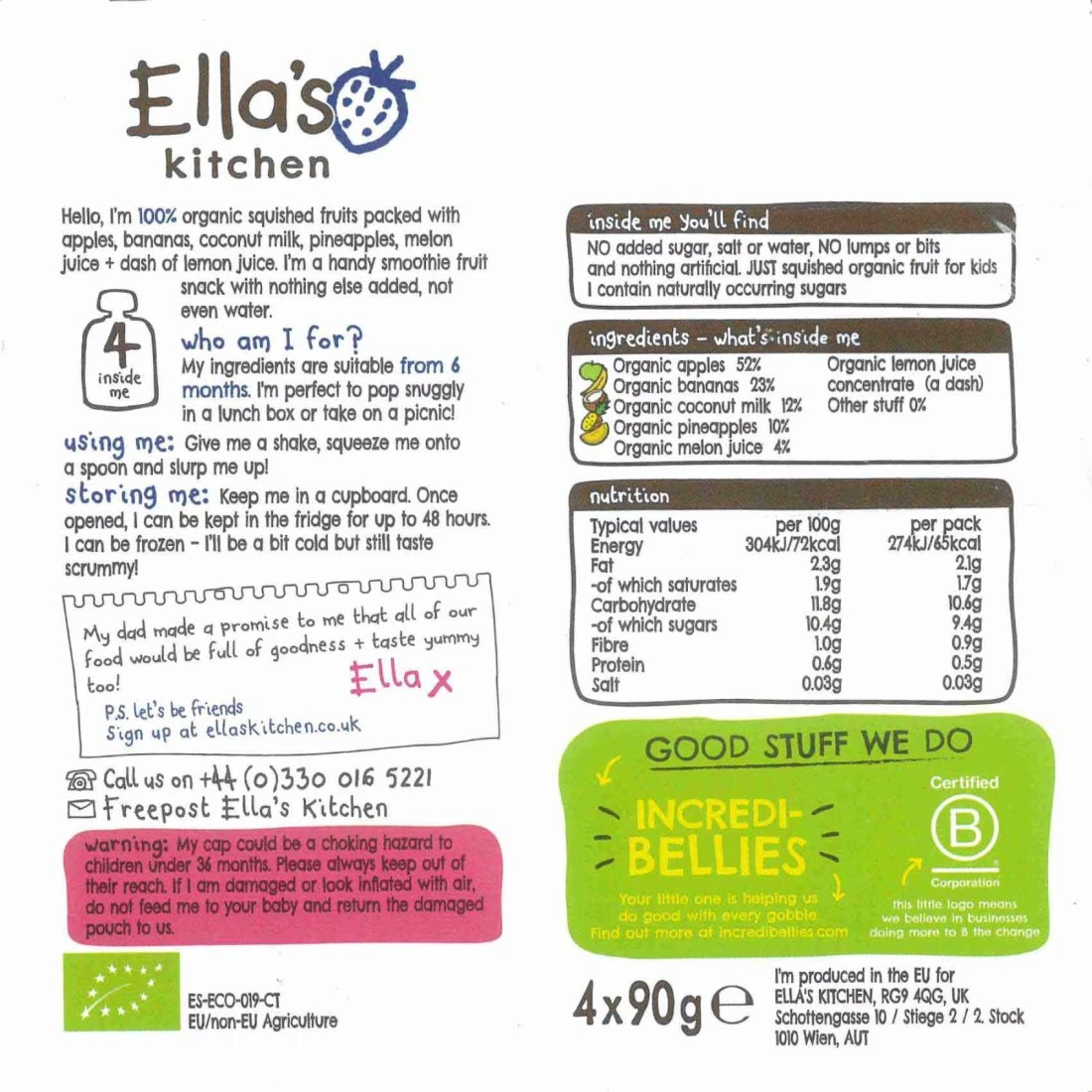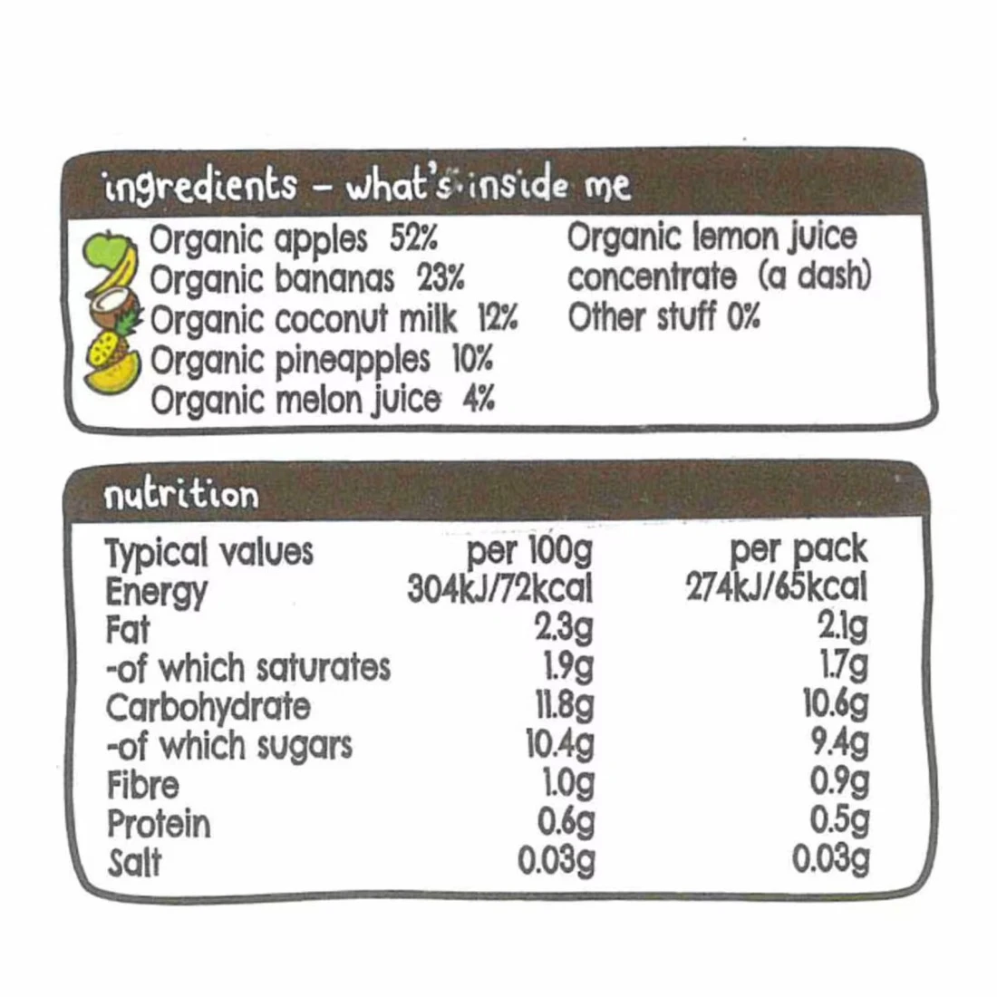 ingredients : موز عضوي 32%، تفاح عضوي 30%، أناناس عضوي 23%، حليب جوز الهند العضوي 15%، مركز عصير الليمون العضوي (داش)، مواد أخرى 0%