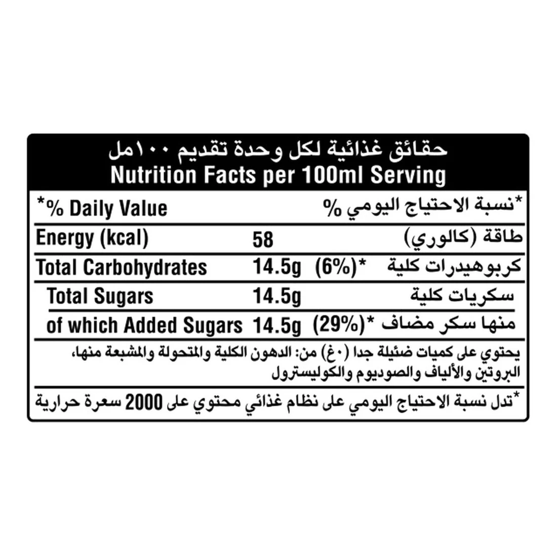 ingredients : مياه غازية، سكر، حمضيات: حمض ستريك، نكهات برتقال طبيعية، مادة حافظة: سوربات البوتاسيوم، فيتامين سي، لون:أصفر سانسيت، مضاد للأكسدة: ثنائي صوديوم الكالسيوم (إثلين ثنائي الأمين ربتعي حمض الخليك)