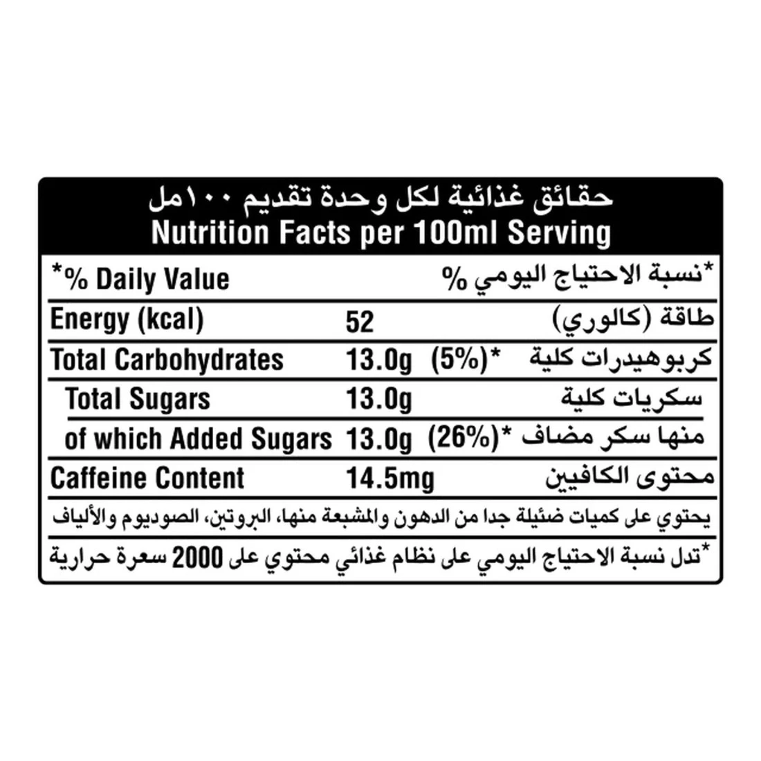 ingredients : مياه غازية، سكر، حمض: حمض ستريك، مستحلب: صمغ عربي، مادة حافظة: سوربات البوتاسيوم، معدل حموضة: سترات الصوديوم، كافيين، نكهات حمضيات طبيعية المتطابقة، مضادات أكسدة: حمض أسكوربيك وثنائي صوديوم الكالسيوم (إثلين ثنائي الأمين ربتعي حمض الخليك)، لون: تارترازين