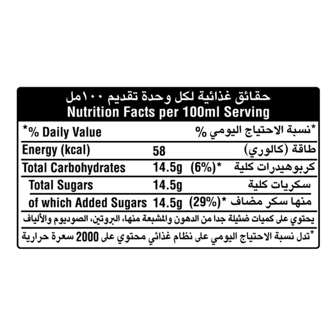 ingredients : مياه غازية، سكر، حمضيات: حمض ستريك، نكهات برتقال طبيعية، مادة حافظة: سوربات البوتاسيوم، فيتامين سي، لون:أصفر سانسيت، مضاد للأكسدة: ثنائي صوديوم الكالسيوم (إثلين ثنائي الأمين ربتعي حمض الخليك)