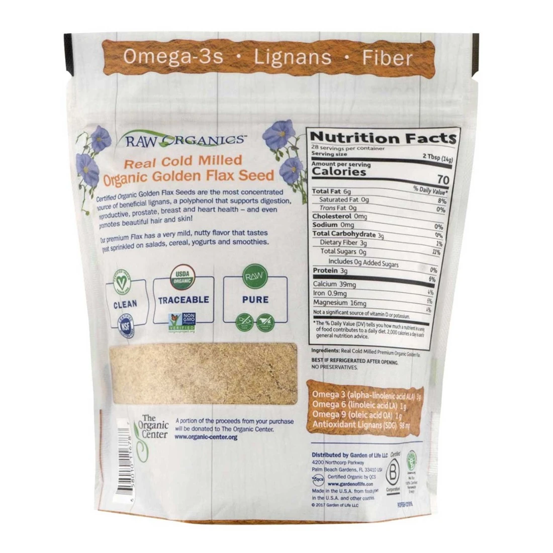 - يوفر كل حصة من حبوب الكتان العضوية المعتمدة الخام المطحونة بالطريقة الباردة من راو أورغانيك ما يصل إلى 5 غرام من أحماض أوميغا الصحية، 3 غرام من أوميغا-3 (حمض ألفا لينولينيك أو ALA)، 1 جرام من أوميغا-6 (حمض لينوليك أو LA) و1 غرام من أوميغا-9 (حمض أوليك أو OA)، بالإضافة إلى 98 مليغرام من الليغنانات المضادة للأكسدة (SDG)