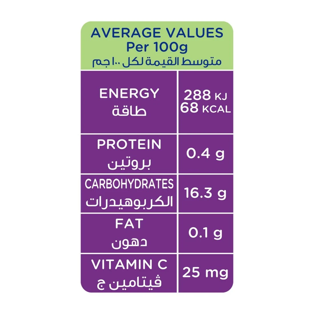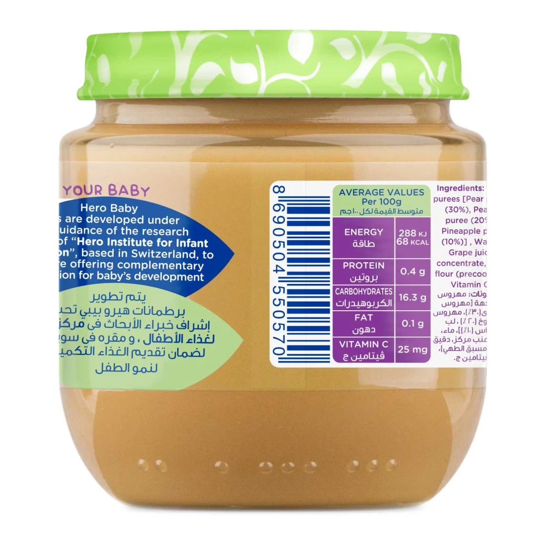 ingredients : مهروسات الفاكهة: مهروس الكمثرى 30%، مهروس الخوخ 20%، لب الأناناس 10%، الماء، مركز عصير العنب، دقيق الأرز، فيتامين سي