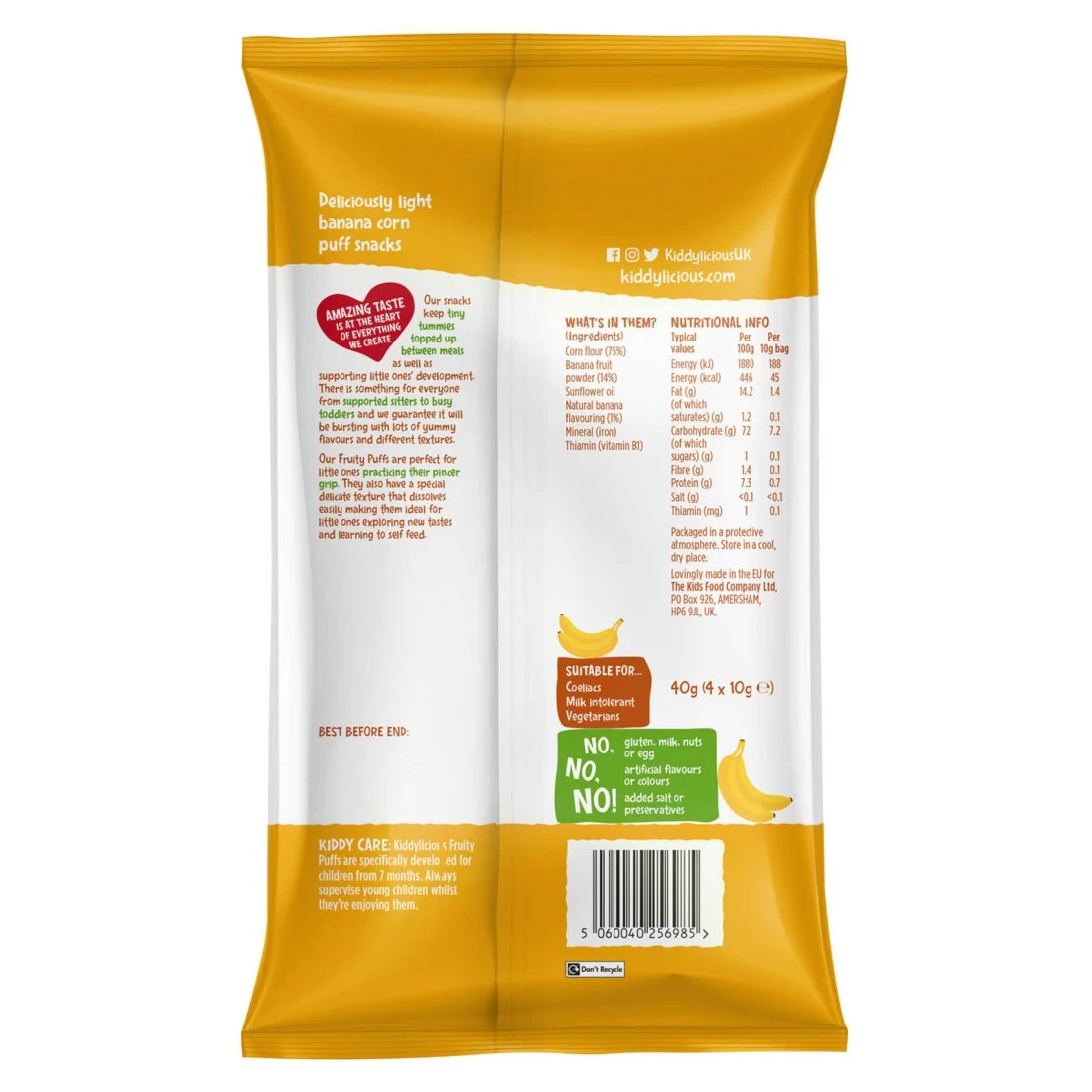 تعتبر رقائق فاكهة الموز من كيديليشوس وجبة خفيفة شهيرة للأطفال الصغار. هذه الرقائق مصنوعة من الموز الحقيقي وخالية من الألوان الاصطناعية والنكهات والمواد الحافظة. لقد تم تصميمها لتذوب بسهولة في الفم مما يجعلها خيارًا آمنًا للوجبات الخفيفة للأطفال الذين بدأوا للتو في تناول الأطعمة الصلبة. كما أن الرقائق خالية من الغلوتين ومناسبة للنباتيين. تأتي في عبوة مريحة بوزن 40 غرام مما يجعلها مثالية للاستخدام أثناء التنقل أو لحفظها في حقيبتك كوجبة خفيفة سريعة وصحية لطفلك.