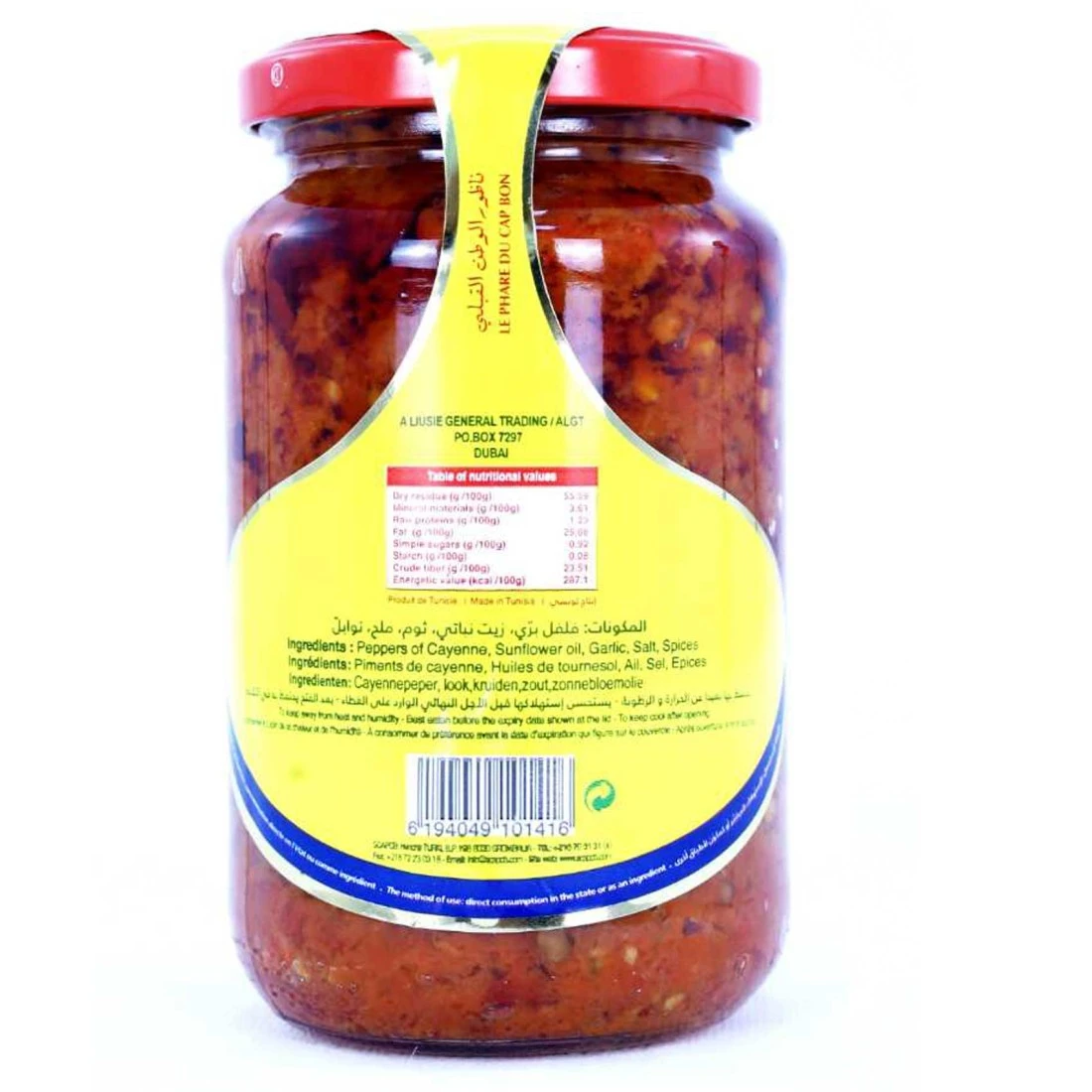 هريس الفلفل البري 370 غرام من لو فار دو كاب بون هو بهار لذيذ وحار يضيف نكهة رائعة إلى أي طبق. مصنوع من مزيج من الفلفل الحار والثوم والتوابل، هذه الهريسة مثالية لإضافة الحرارة إلى وصفاتك المفضلة. سواء كنت تشوي اللحوم أو تقلي الخضار أو تدهنها على شطيرة، فإن هذه الهريسة ستأخذ وجباتك إلى المستوى التالي. مع نكهته الجريئة واللاذعة، فإن هريس الفلفل البري 370 غرام من لو فار دو كاب بون 370 غرام هو بهار متعدد الاستخدامات يمكن استخدامه بعدة طرق. امزجه في التتبيلات للحصول على لمسة حارة، أو قلّبه في الحساء واليخنات لمزيد من العمق في النكهة، أو استخدمه كصلصة غمس للبطاطس المقلية وأجنحة الدجاج. بغض النظر عن الطريقة التي تختارها لاستخدامه، من المؤكد أن هذه الهريسة ستثير إعجاب براعم التذوق لديك. هريس الفلفل البري 370 غرام من لو فار دو كاب بون مصنوع من مكونات عالية الجودة ووصفات تونسية تقليدية. يُمزج الفلفل المخلل والتوابل بعناية فائقة لتكوين توابل متوازنة ولذيذة تُضفي نكهة مميزة على أي طبق. سواء كنت من محبي الطعام الحار أو ترغب فقط في إضافة لمسة مميزة إلى وجباتك، فإن هذه الهريسة عنصر أساسي لا غنى عنه في مطبخك.