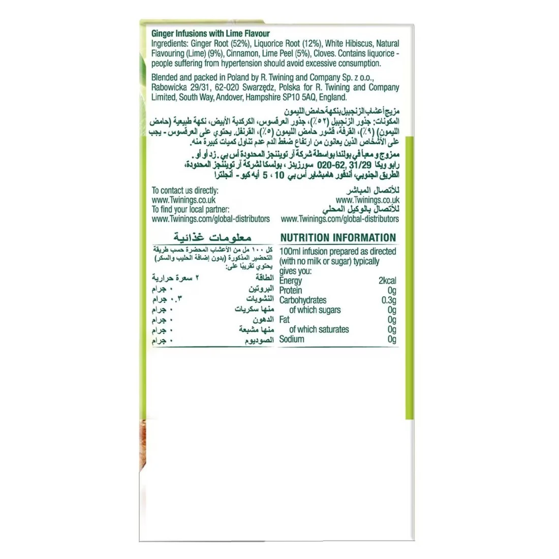 ingredients : جذر الزنجبيل (52%)، جذر عرق السوس (12%)، الكركديه الأبيض، نكهة طبيعية (ليمون) (9%)، قرفة، قشر الليمون (5%)، قرنفل