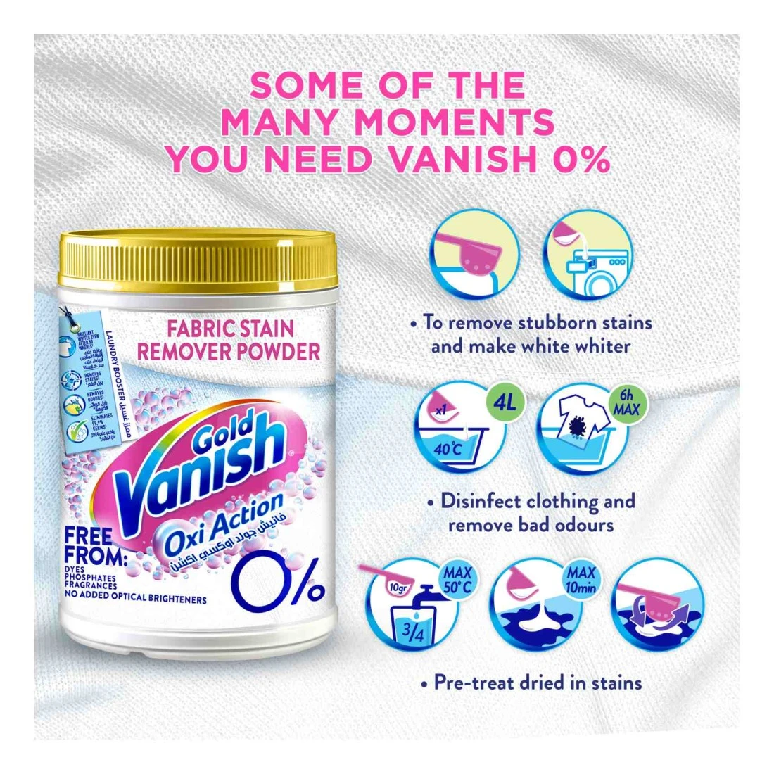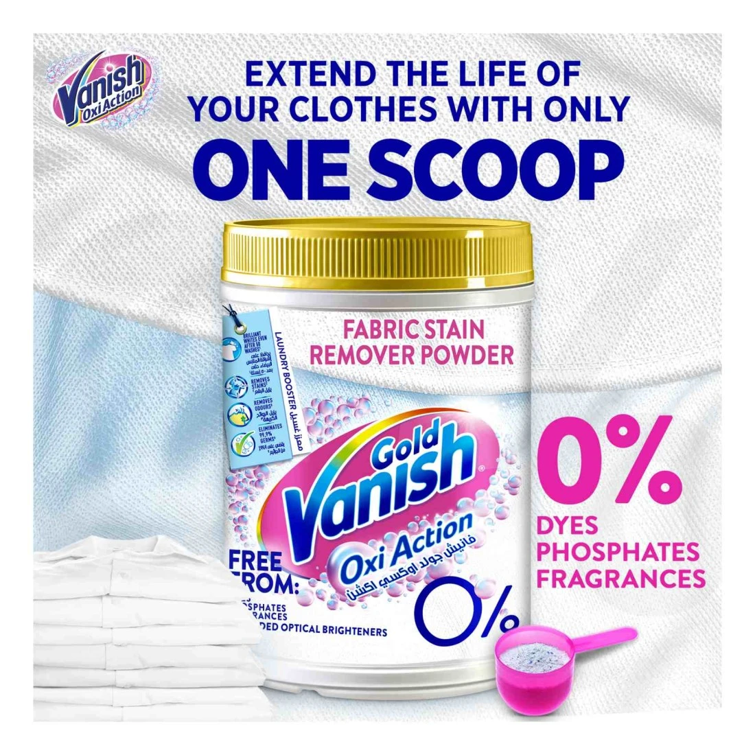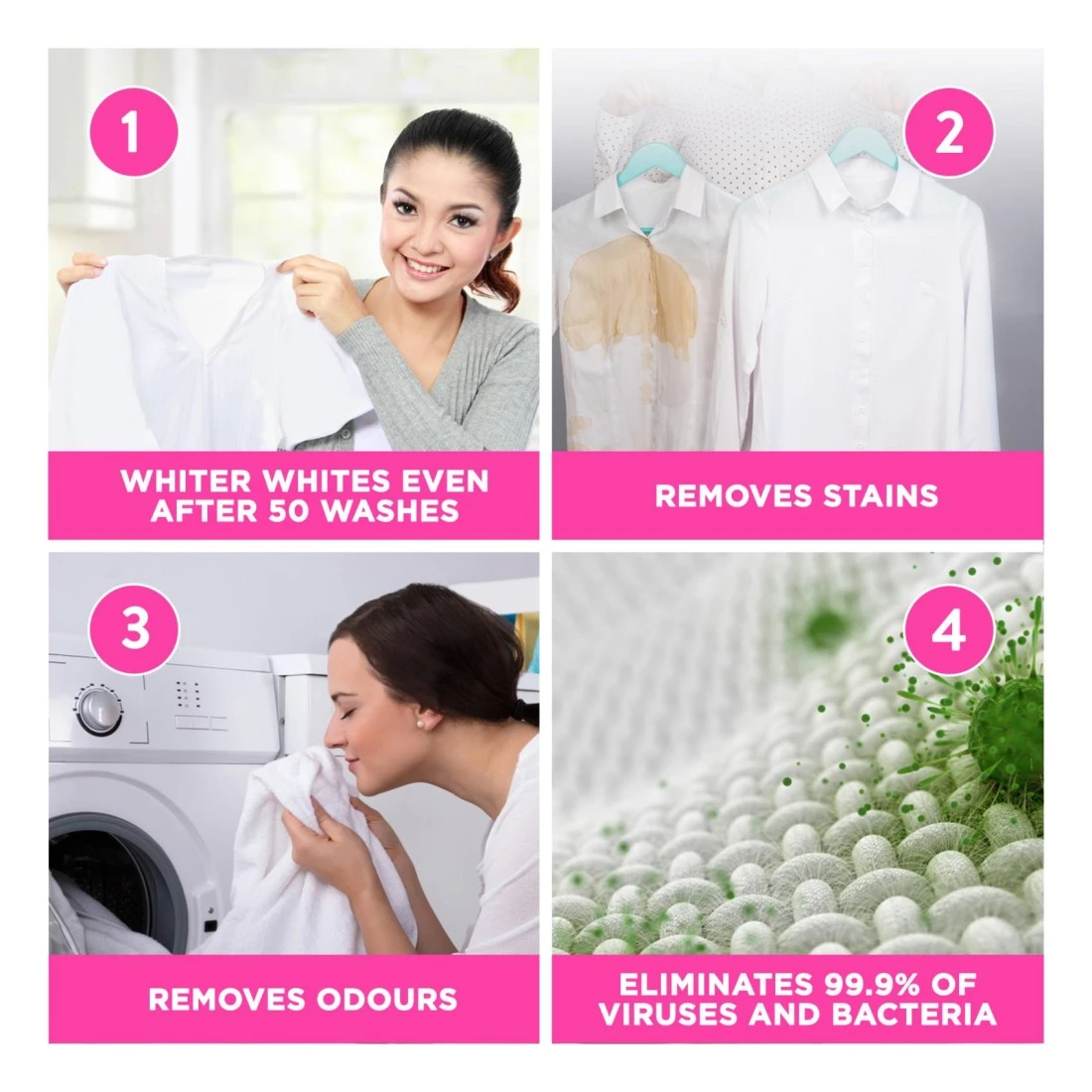 - يبيّض الملابس البيضاء ويجعل الملابس الملونة أكثر إشراقًا باستخدام مُبيّضاته النشطة