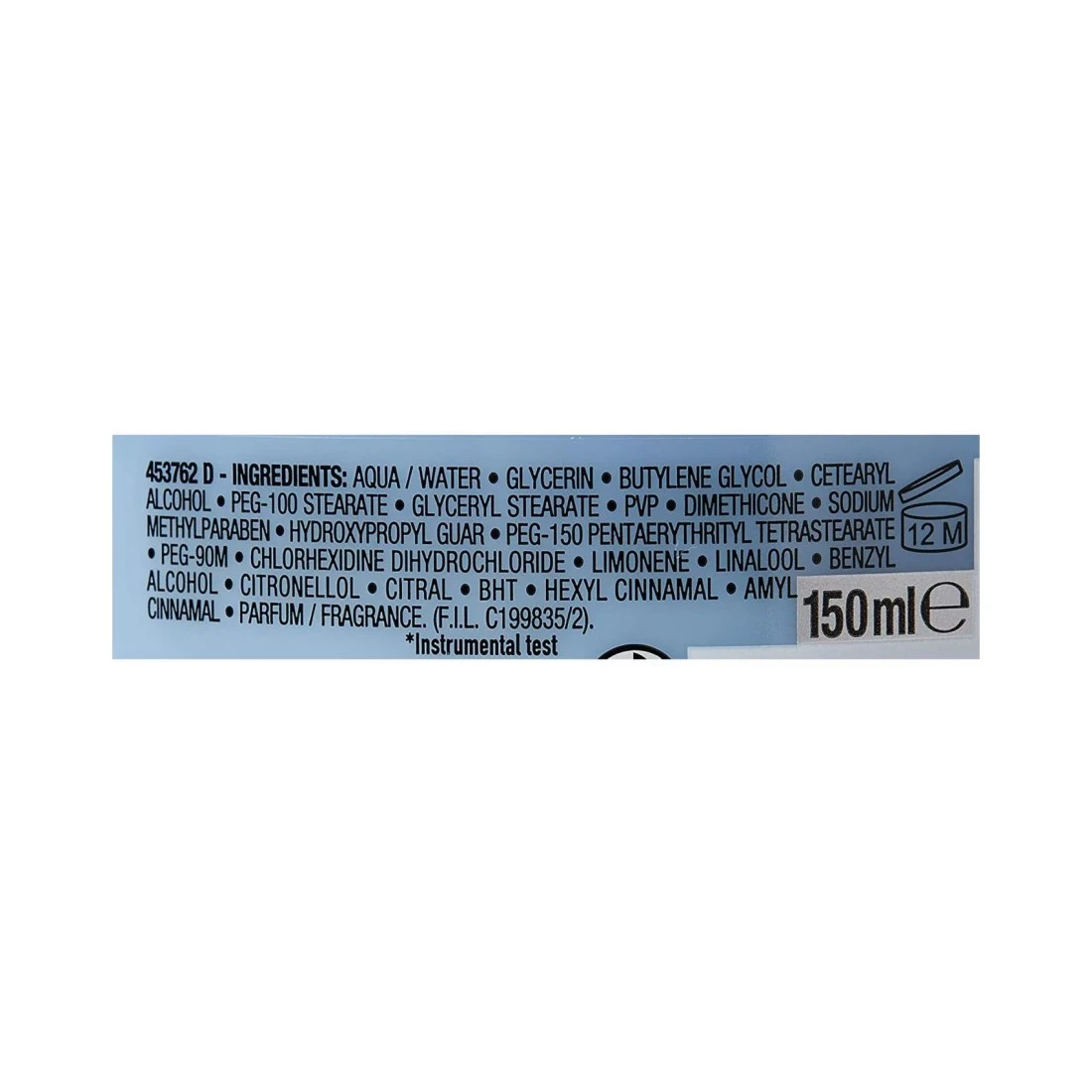 ingredients : ماء، جليسرين، بيوتيلين غليكول، كحول الستيريل، Peg - 100ستيارات، ستيارات الجليسيريل، بولي فينيل بيروليدون، السيليكون، ميثيل بارابين الصوديوم، هيدروكسي بروبيل جوار، Peg-150 بنتايرثريتيل تتراستيرات، بيج-90إم، كلورهيكسيدين، ديهيدروكلوريد الكلورهيكسيدين، ليمونين، لينالول، بوتيلفينيل ميثيلبروبيونال، سيترونيلول، سيترال، هكسيل سينامال، أميل سينامال، عطر/رائحة.