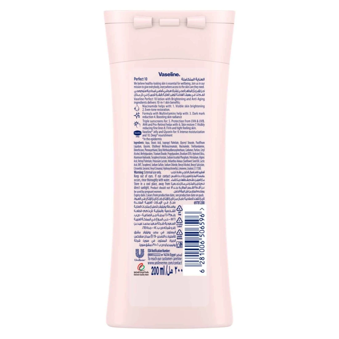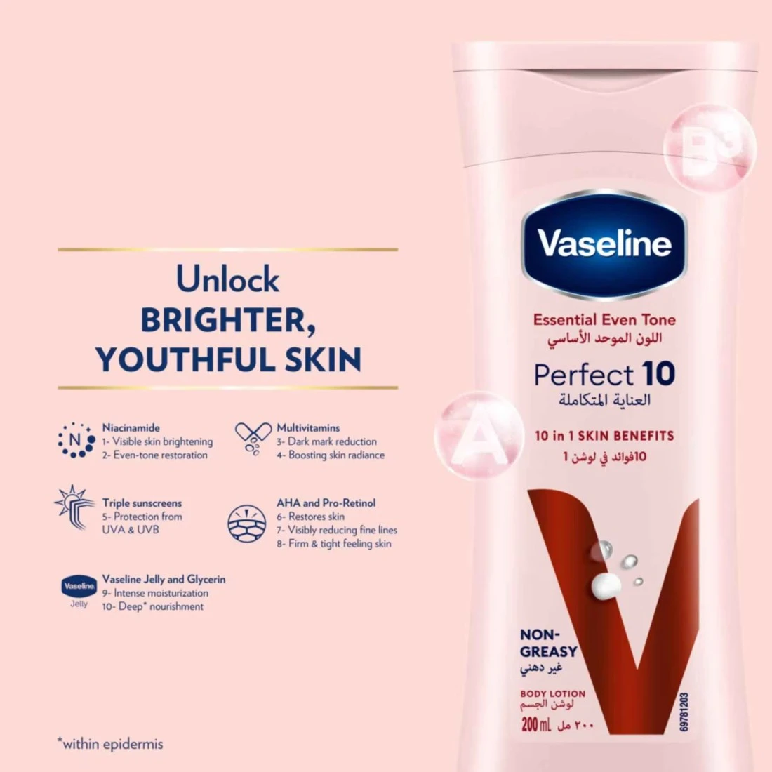 احصلي على 10 فوائد في واحد لبشرة تبدو وتشعر بصحة جيدة. تواجه بشرتك أضرارا يومية من الحرارة وأشعة الشمس والتلوث البيئي. يساعد الترطيب اليومي باستخدام لوشن ڤازلين اللون الموحد الأساسي على تخفيف آثار أضرار أشعة الشمس وحماية بشرتك من المزيد من الضرر. يوفر مزيج المكونات القوية في هذا اللوشن المغذي والوقائي فوائد متعددة وهي:* يوفر النياسيناميد إشراقة ظاهرة للبشرة واستعادة اللون الموحد.* تساعد التركيبة المملوءة بالفيتامينات المتعددة على تقليل البقع الداكنة وزيادة إشراقة البشرة.* يوفر واقي الشمس الثلاثي حماية من الأشعة فوق البنفسجية UVA وUVB.* أحماض ألفا هيدروكسي والبرو-ريتينول يساعدان على إعادة بناء البشرة وتخفيف ظهور الخطوط الدقيقة بشكل ظاهر وشد البشرة وجعلها أكثر نعومة.* يوفر ڤازلين جلي والجلسرين ترطيبًا مكثفًا وتغذية عميقة لبشرتك.يتم امتصاص التركيبة الخفيفة وغير الدهنية بسرعة للمساعدة في تجديد رطوبة بشرتك من العمق* في الداخل. يمكن استخدام غسول الجسم المشرق والمرطب لجميع أنواع البشرة يوميًا على اليدين والجسم لمساعدتك على الحصول على بشرة مشرقة ومتألقة تشعر بالنعومة والانسيابية.لقد صمدت خبرة ڤازلين في العناية بالبشرة أمام اختبار الزمن، وقد تم الوثوق بجلي الڤازلين الخاص بنا لحماية البشرة لأكثر من 150 عامًا. ثقي بالڤازلين للعناية وحماية بشرتك.*داخل الطبقة القرنية.