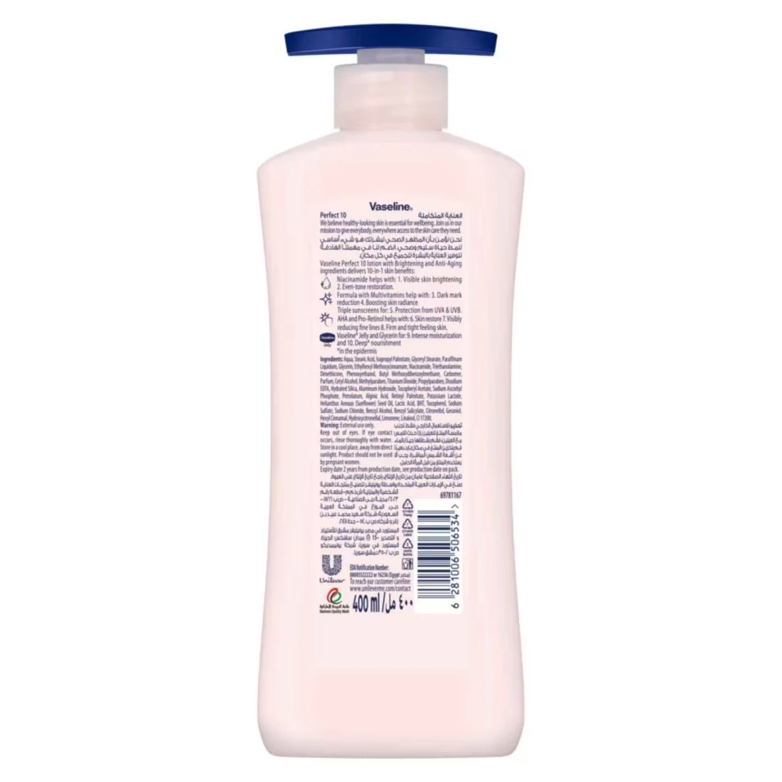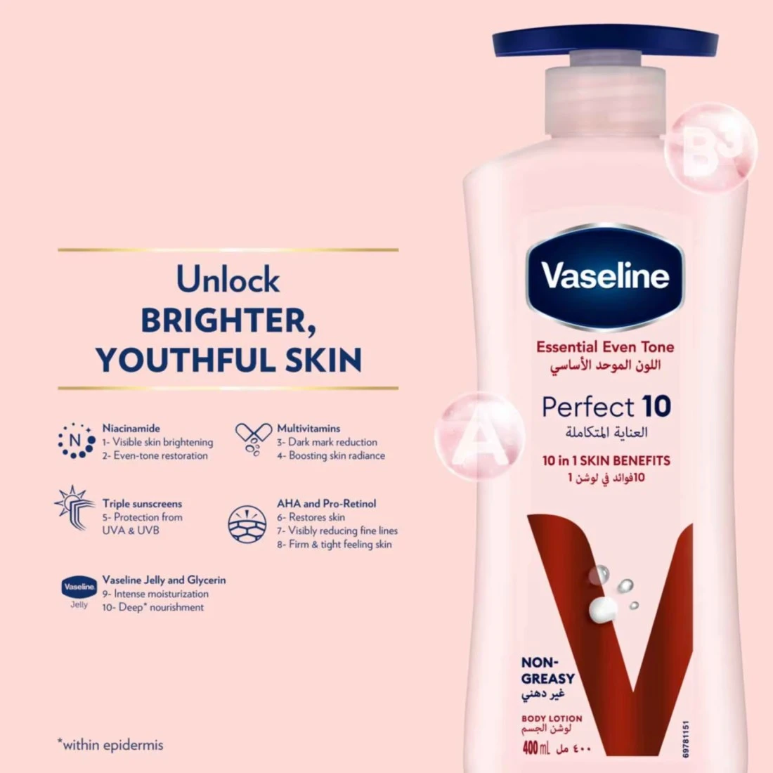 احصلي على 10 فوائد في واحد لبشرة تبدو وتشعر بصحة جيدة. تواجه بشرتك أضرارا يومية من الحرارة وأشعة الشمس والتلوث البيئي. يساعد الترطيب اليومي باستخدام لوشن ڤازلين اللون الموحد الأساسي على تخفيف آثار أضرار أشعة الشمس وحماية بشرتك من المزيد من الضرر. يوفر مزيج المكونات القوية في هذا اللوشن المغذي والوقائي فوائد متعددة وهي:* يوفر النياسيناميد إشراقة ظاهرة للبشرة واستعادة اللون الموحد.* تساعد التركيبة المملوءة بالفيتامينات المتعددة على تقليل البقع الداكنة وزيادة إشراقة البشرة.* يوفر واقي الشمس الثلاثي حماية من الأشعة فوق البنفسجية UVA وUVB.* أحماض ألفا هيدروكسي والبرو-ريتينول يساعدان على إعادة بناء البشرة وتخفيف ظهور الخطوط الدقيقة بشكل ظاهر وشد البشرة وجعلها أكثر نعومة.* يوفر ڤازلين جلي والجلسرين ترطيبًا مكثفًا وتغذية عميقة لبشرتك.يتم امتصاص التركيبة الخفيفة وغير الدهنية بسرعة للمساعدة في تجديد رطوبة بشرتك من العمق* في الداخل. يمكن استخدام غسول الجسم المشرق والمرطب لجميع أنواع البشرة يوميًا على اليدين والجسم لمساعدتك على الحصول على بشرة مشرقة ومتألقة تشعر بالنعومة والانسيابية.لقد صمدت خبرة ڤازلين في العناية بالبشرة أمام اختبار الزمن، وقد تم الوثوق بجلي الڤازلين الخاص بنا لحماية البشرة لأكثر من 150 عامًا. ثقي بالڤازلين للعناية وحماية بشرتك.*داخل الطبقة القرنية.