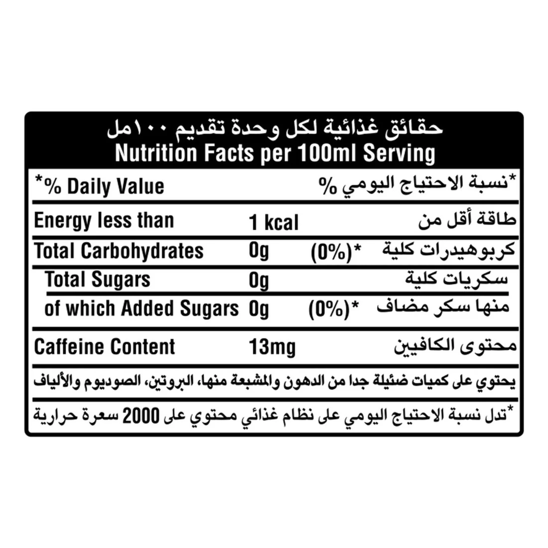 ingredients : ماء معدني معبأ بالغاز الكربوني، لون الكراميل، حمض الفسفوريك، حمض الستريك، نكهات الكولا الطبيعية، محليات: الأسبارتام (240 ملغ/لتر) والأسيسلفام البوتاسيوم (160 ملغ/لتر)، مادة حافظة: بنزوات الصوديوم، مثبت الحموضة: سترات الصوديوم، الكافيين.