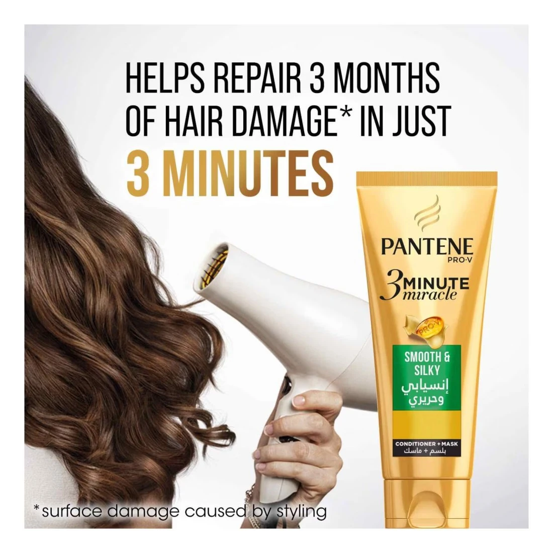 اكتشفي تركيبة بانتين برو-في معجزة 3 دقائق قوة علاج الشعر في البلسم اليومي. بانتين معجزة 3 دقائق انسيابي وحريري هو بلسم وماسك للشعر في منتج واحد معبأ بقوة برو-في التي تساعد على إصلاح ثلاثة أشهر من تلف الشعر السطحي الناجم عن التصفيف اليومي في غضون ثلاث دقائق فقط، مما يجعل الشعر يتدفق بحرية ونعومة ومليئ بالحياة. توفر تركيبته المكثفة القوة في لب الشعر بينما تذوب بالتساوي على طول ألياف الشعر. يتميز بانتين برو-في معجزة 3 دقائق أيضا بمزيد من مكونات الترطيب * لتوفير نعومة ولمعان فائقين للشعر مع المساعدة في منع تقصف الأطراف وتجعدها. مناسب للاستخدام اليومي بانتين معجزة 3 دقائق انسيابي وحريري يغذي الشعر أيضا ويتركه ناعما للغاية ولامعا طوال اليوم. *مقابل. بلسم بانتين العادي.