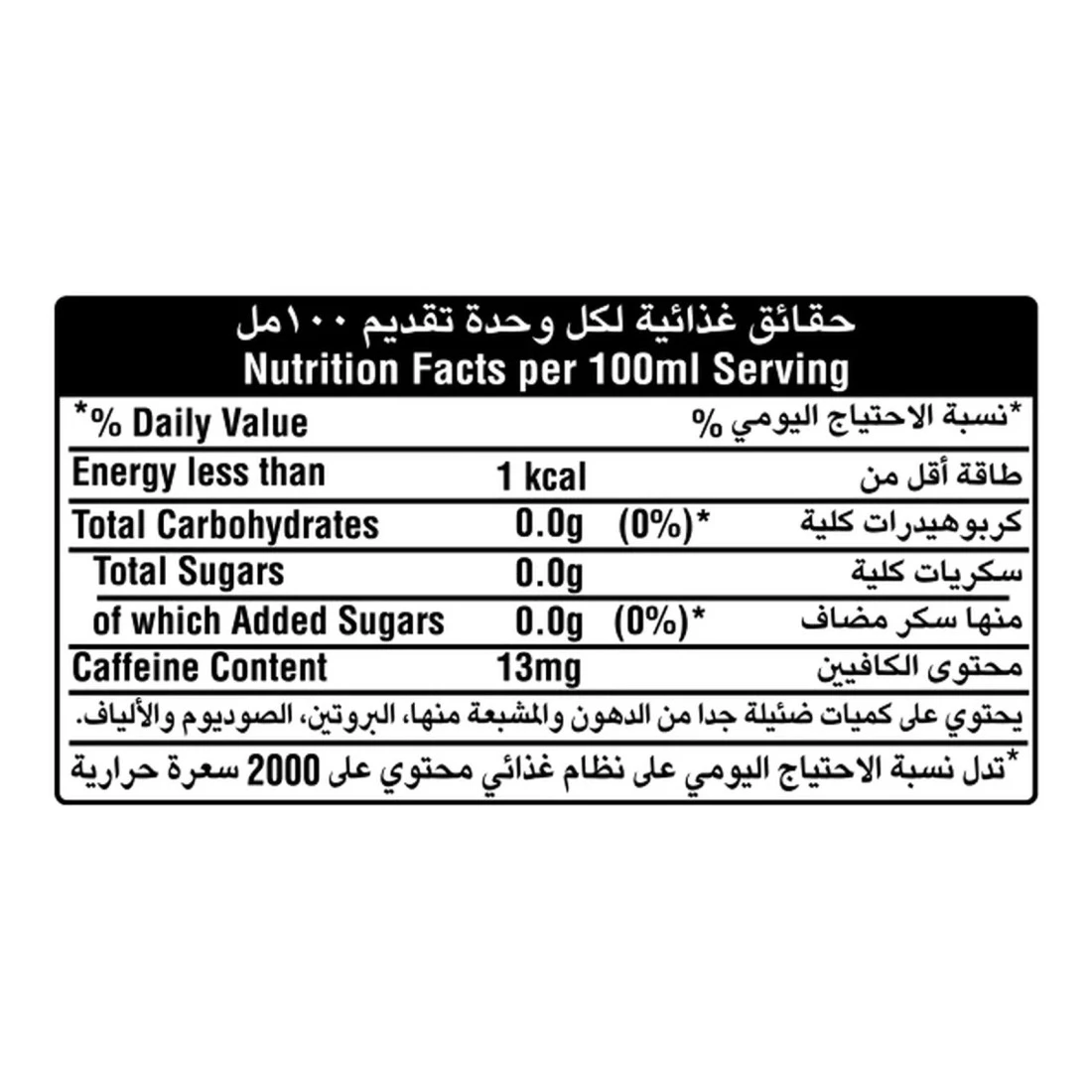 ingredients : مياه غازية، لون كراميل، حمضيات: حمض فوسفوريك، حمض ستريك، نكهات كولا طبيعية، محليات: أسبارتام (240 ملغ/لتر) وأسيسولفام البوتاسيوم (160 ملغ/لتر)، مادة حافظة: بنزوات الصوديوم، معدل حموضة: سترات الصوديوم، كافيين