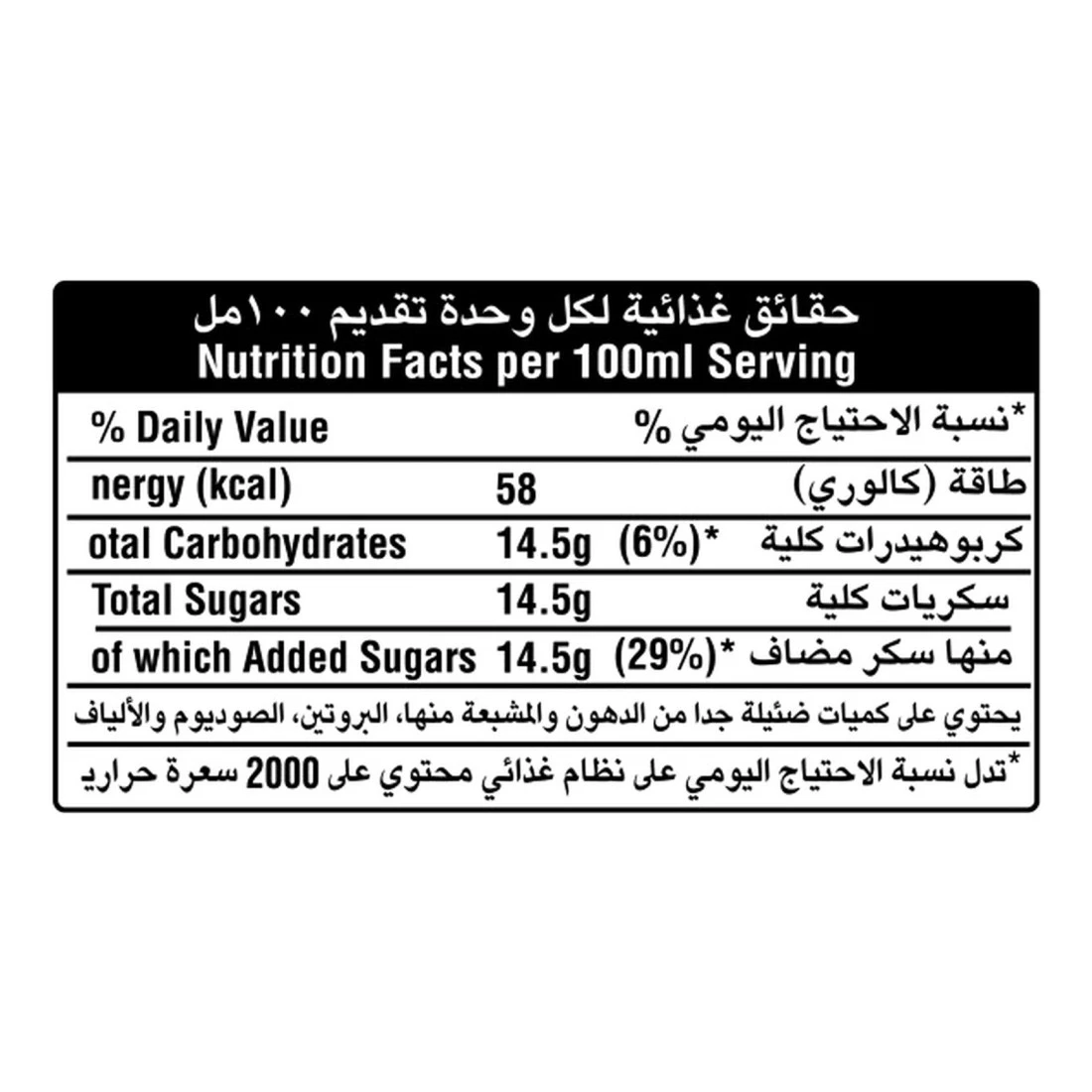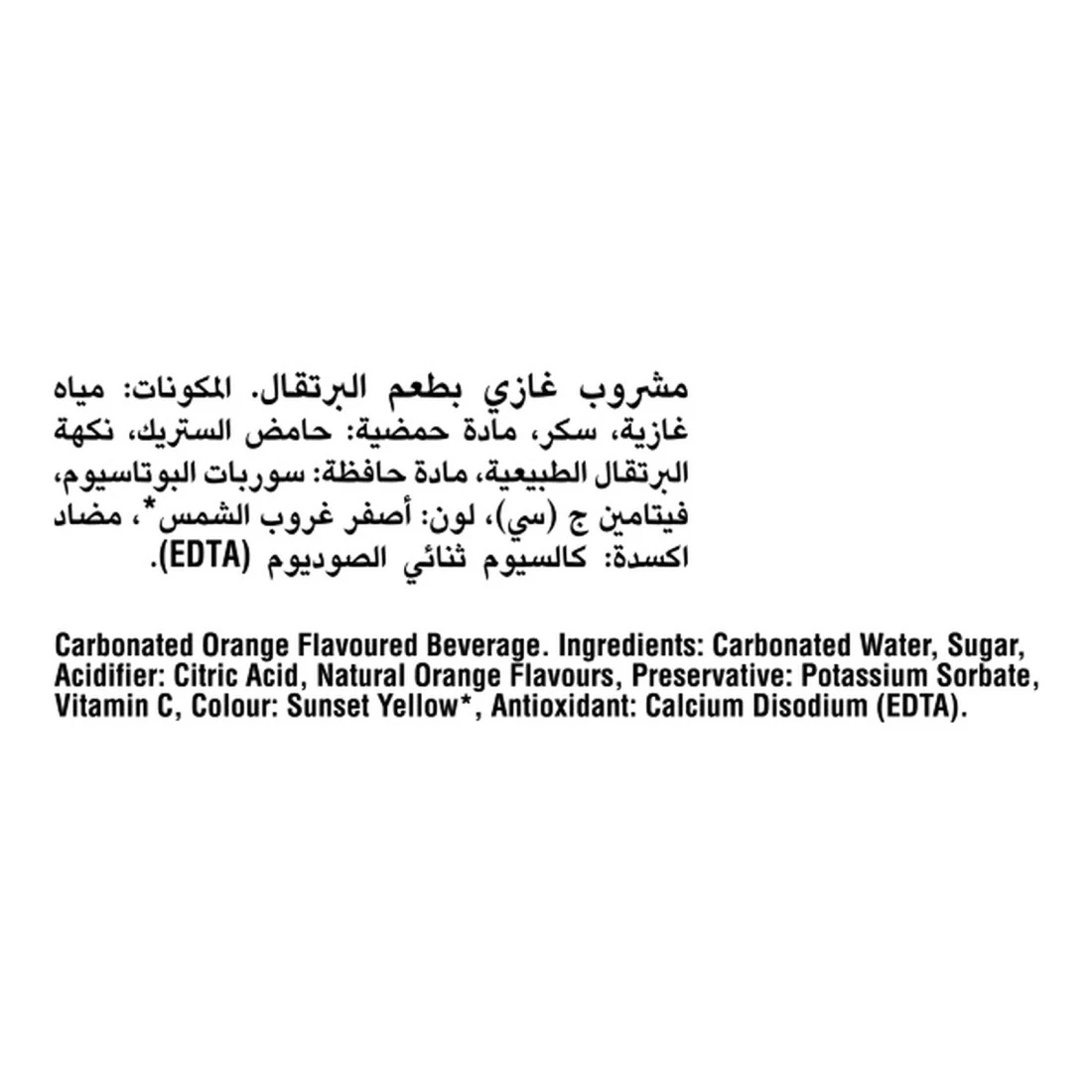 ingredients : مياه غازية، سكر، حمضيات: حمض ستريك، نكهات برتقال طبيعية، مادة حافظة: سوربات البوتاسيوم، فيتامين سي، لون:أصفر سانسيت، مضاد للأكسدة: ثنائي صوديوم الكالسيوم (إثلين ثنائي الأمين ربتعي حمض الخليك)