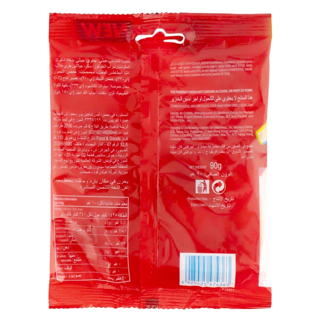 ingredients : سكر، شراب الغلوكوز، نشويات غذائية معدلة، ماء، أحماض: حمض الستريك، حمض الفوماريك، مواد تزجيج: شيلاك، شمع العسل، شمع الكرنوبا، منكهات.