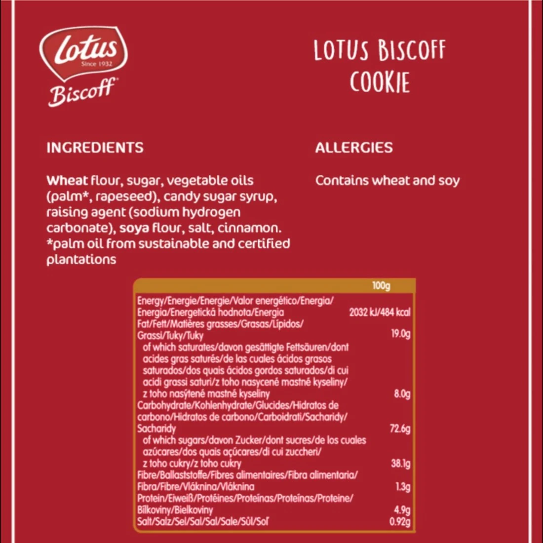 - تحتوي كل عبوة على 125 غرامًا من بسكويت لوتس بيسكوف، مثالية للمشاركة أو الاستمتاع بها بمفردها