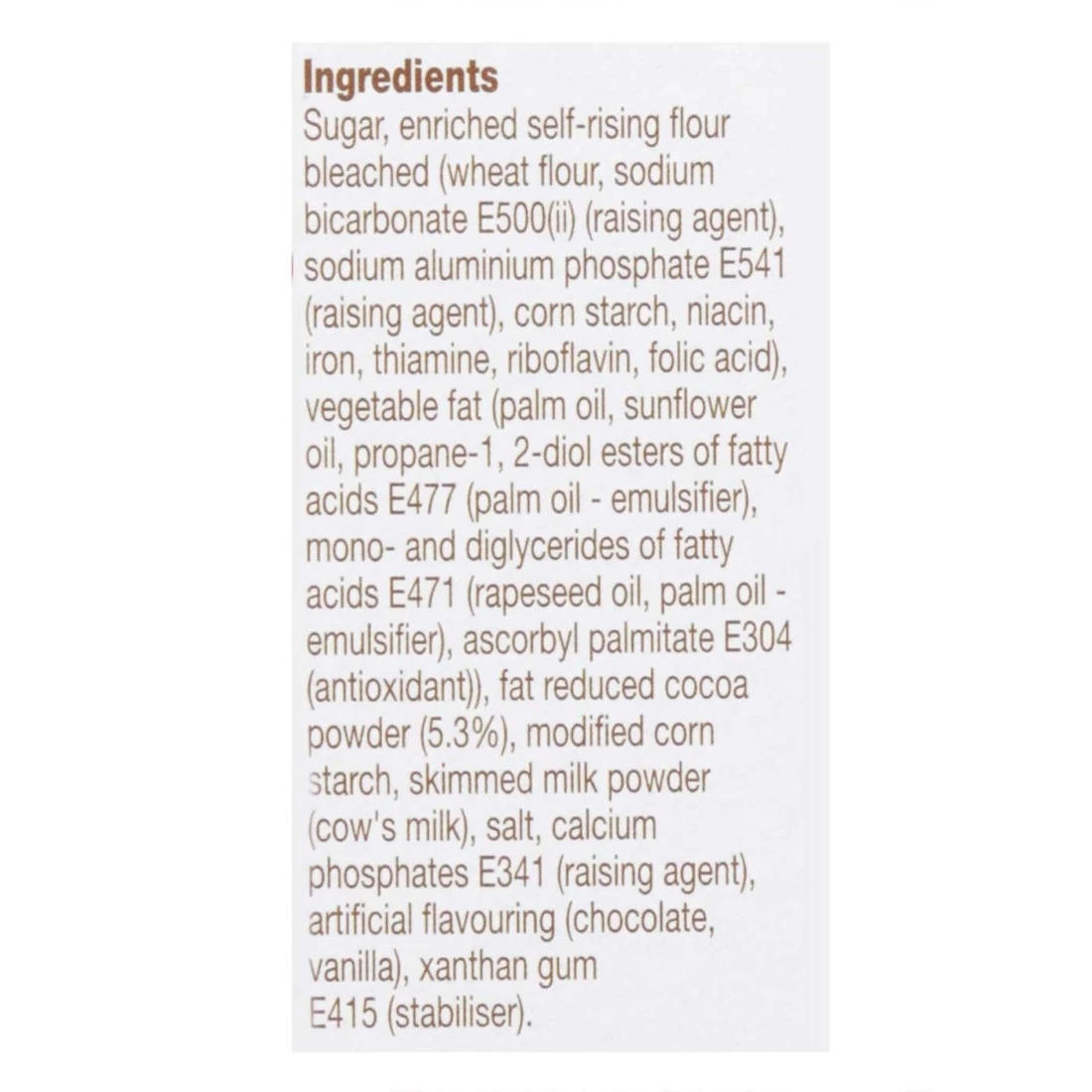 ingredients : دقيق قمح مبيض ذاتي التخمير مدعم بالسكر (بيكربونات الصوديوم E500(ii) (عامل رفع) فوسفات ألومنيوم الصوديوم E541 (عامل رفع) نشا الذرة نياسين حديد ثيامين ريبوفلافين حمض الفوليك) دهون نباتية (زيت النخيل زيت دوار الشمس بروبان 12 إسترات ديول للأحماض الدهنية E477 (مستحلب زيت النخيل) أحادي وثنائي غليسريد الأحماض الدهنية E471 (مستحلب زيت بذور اللفت زيت النخيل) بالميتات أسكوربيل E304 (مضاد للأكسدة)) مسحوق كاكاو قليل الدسم (5.3%) نشا ذرة معدل مسحوق حليب خالي الدسم (حليب بقري) ملح فوسفات الكالسيوم E341 (عامل رفع) نكهة اصطناعية (شوكولاطه فانيليا) صمغ زانثان E415 (مثبت)