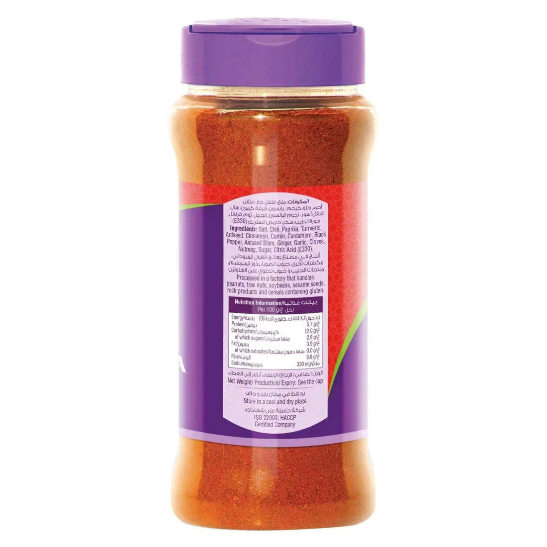 ingredients : ملح ، فلفل حار ، فلفل أحمر حلو ، كركم ، يانسون ، قرفة ، كمون ، هيل ، فلفل أسود ، نجوم اليانسون ، زنجبيل ، ثوم ، قرنفل ، جوزة الطيب ، سكر ، حامض الستريك (إي 330).