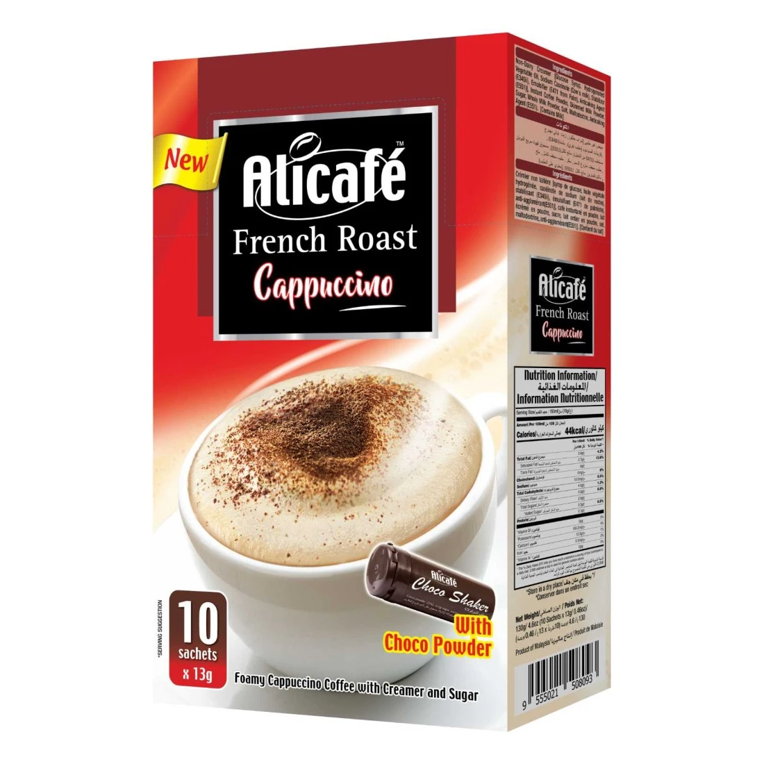ingredients : مبيض خالي من الألبان [شراب الغلوكوز، زيت نباتي مهدرج، كازينات الصوديوم (حليب البقر)، مثبت (E340)، مستحلب (E471 من نخيل)، عامل مضاد للتكتل (E551)]، مسحوق قهوة سريعة التحضير، مسحوق حليب منزوع الدسم، سكر، مسحوق حليب كامل الدسم ، ملح، مالتوديكسترين، عامل مضاد للتكتل (E551). [تحتوي على شيكر شوكو الحليب: مسحوق (مسحوق كاكاو 35%، سكر بودرة، إستر السكر)