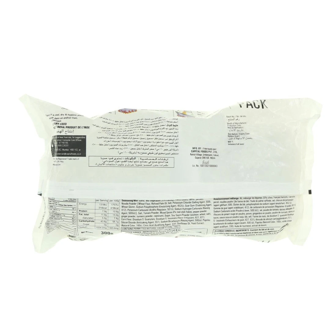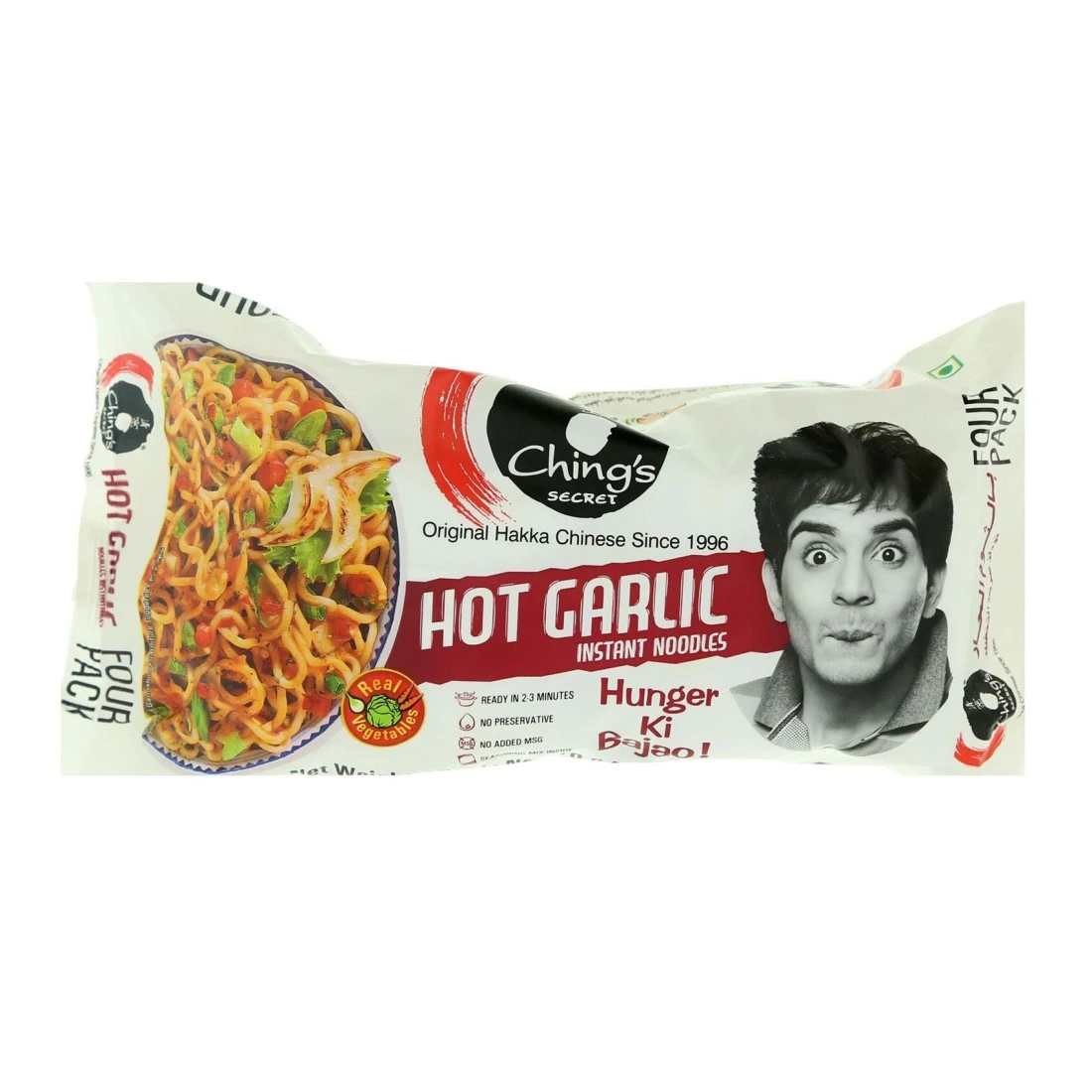 ingredients : نودلز: دقيق القمح، زيت النخيل المكرر، ملح، غلوتين القمح، كلوريد البوتاسيوم (عامل تزجيج/مستحلب (452 (i)))، كربونات البوتاسيوم (منظم الحموضة (5010)، كربونات الصوديوم (عامل رافع (500 (ii)))، ثنائي بوتيل هيدروكينون (مضاد الأكسدة (319)). مزيج التوابل: ملح، بهارات متنوعة 10% (فلفل حار، بصل، كركم، زنجبيل، فلفل)، طحين، مسحوق الطماطم، سكر، خضروات مجففة 2.4% (جزر، بقدونس).