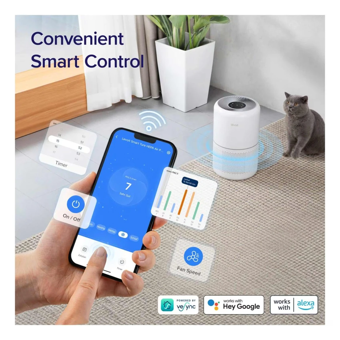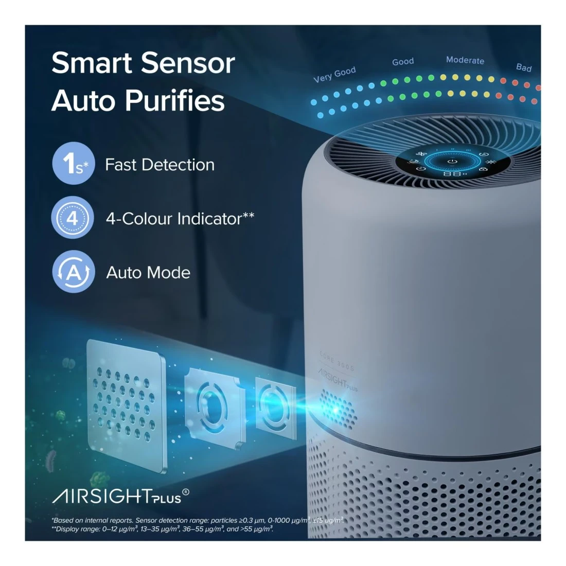 - بهاميزات ذكية، مثل الوضع التلقائي ووضع السكون، فهي تضبط سرعة المروحة ومستوى الضوضاء وفقًا لذلك لتوفير هواء نظيف دون إزعاج أنشطتك اليومية أو نومك
