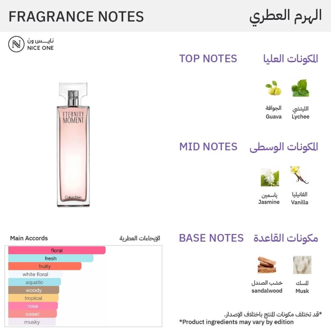 عطر اترنتي مومنت من كالفن كلاين للنساء تميزي برائحة جريئة وجذابةبدأت قصة هذا العطر النسائي الزهري عام 2004.مزيج غني يبدأ مع الجوافة والليتشي وزهر الرمان في مقدمة العطر. وفي قلب العطر زهرة العاطفة والفاوانيا وزنبق الماء والياسمين.في حين تتكون قاعدة العطر من توت العُليق وخشب ورد باليساندر والمسك والكاشميران.مصمم خصيصاً ليناسب كل المناسبات وكل مواسم العام.تبدأ رائحة العطر بالليشي والجوافة والرمان ونبات عود الصليب القرنفلي.بينما قلب العطر يحتوي على زهرة الآلام والنمفيا والمسك.وقاعدة العطر تحتوي على خشب الورد والفراولة والكشمير.
