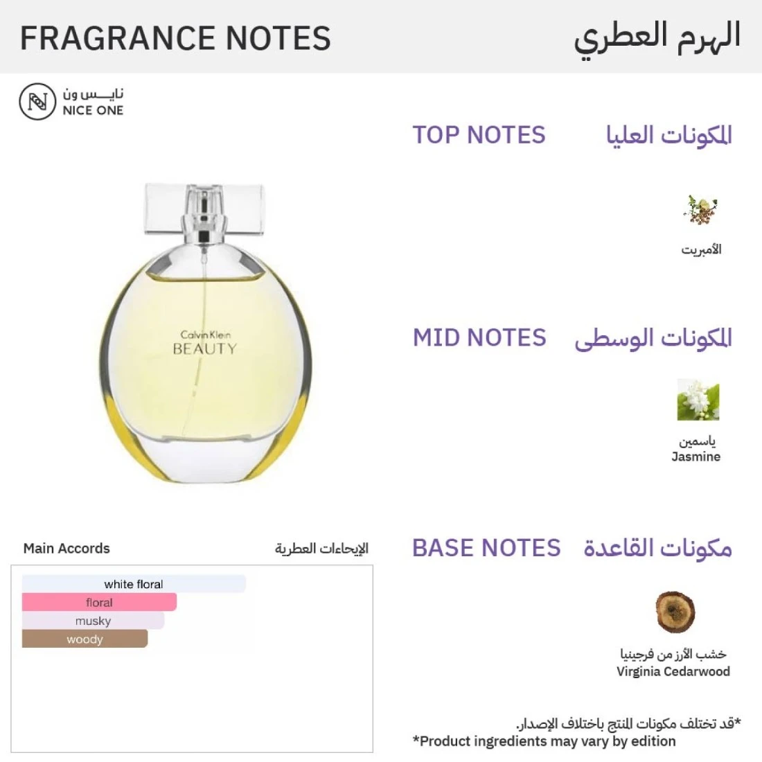 عطر بيوتي من كالفن كلاين للنساءحضور جذاب وأنيقعطر زهري أنيق للنساء بدأت قصته عام 2013.مستوحى من الرائحة الأنثوية لزنبق كالا.يمثل الأناقة والرقي والخلود والجمال.تبدأ رائحة العطر بالأمبريت.بينما قلب العطر يحتوي على الياسمين.محاطة برائحة القاعدة التي تحتوي على خشب الأرز من فرجينيا