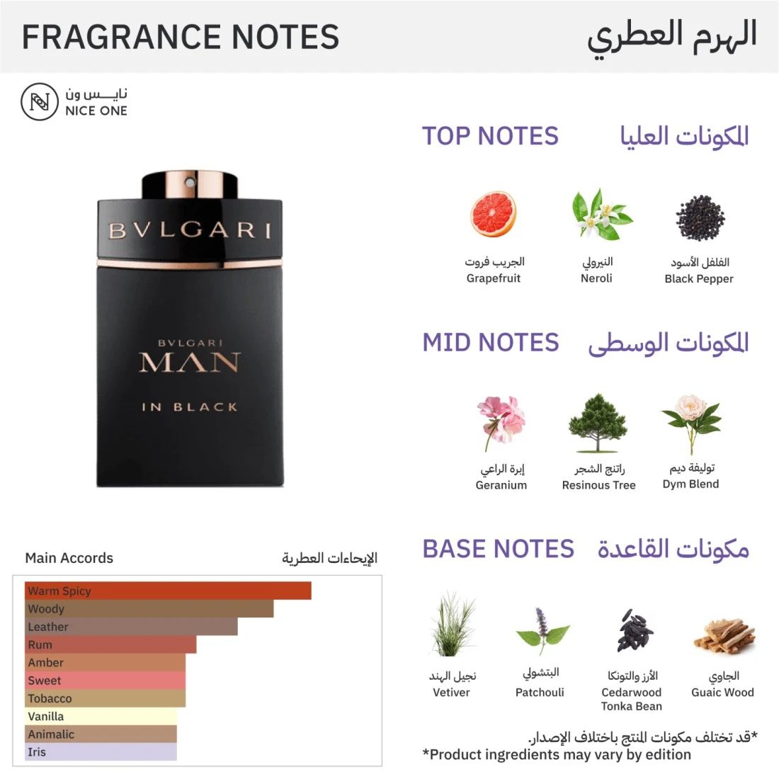 عطر مان ان بلاك من بولغاري للرجال رائحة رجالية فاخرةعطر رجالي مميز شرقي بدأت قصته عام 2010.لتكن رائحة عطرك الزكية خالدة. عطر أنيق مناسب لكل الأوقات. عطر خاص بالرجال من عائلة العطريات الجلدية.عطر خشبي حمضي للرجل الأنيق.ذو رائحة عاطفية دافئة مثيرة غامضة.تبدأ رائحة العطر بالجريب فروت والنيرولي والفلفل الأسود.بينما قلب العطر مكون من إبرة الراعي وراتنج الشجر وتوليفة ديم.محاط برائحة القاعدة المكونة من نجيل الهند والبتشولي والأرز والتونكا والجاوي.