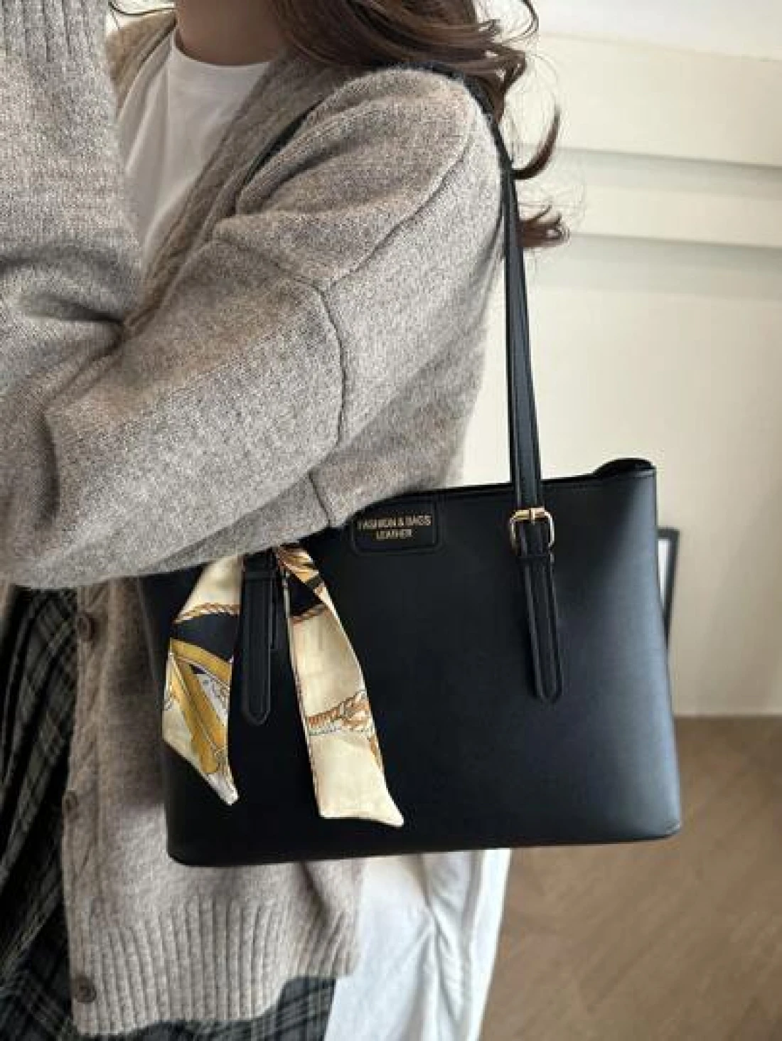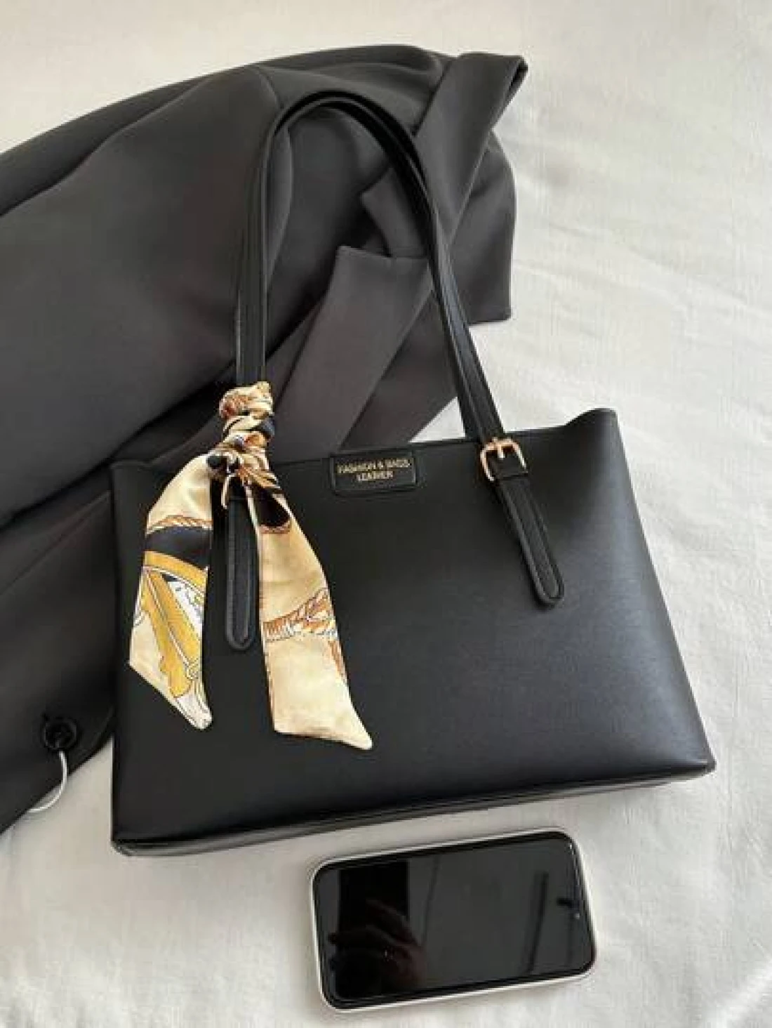 حقيبة تسوق بطبعة حرف بلون أحادي عصرية وبسيطة مع وشاح، مناسبة للتسوق، المحافظ، الشابات، طلاب الجامعة، الوافدين الجدد، العاملين بالمكاتب. وهي مناسبة جدًا للمكاتب، الجامعات، العمل، الأعمال، التنقل، الأنشطة الخارجية، السفر، والخروجات