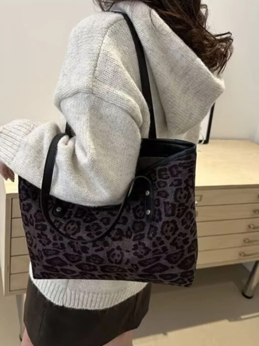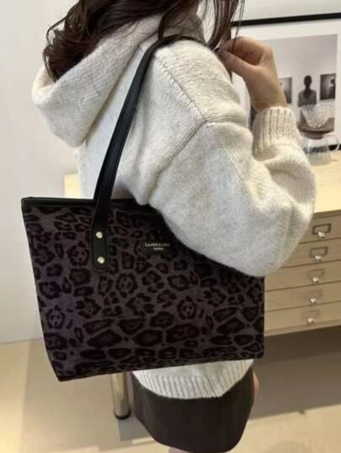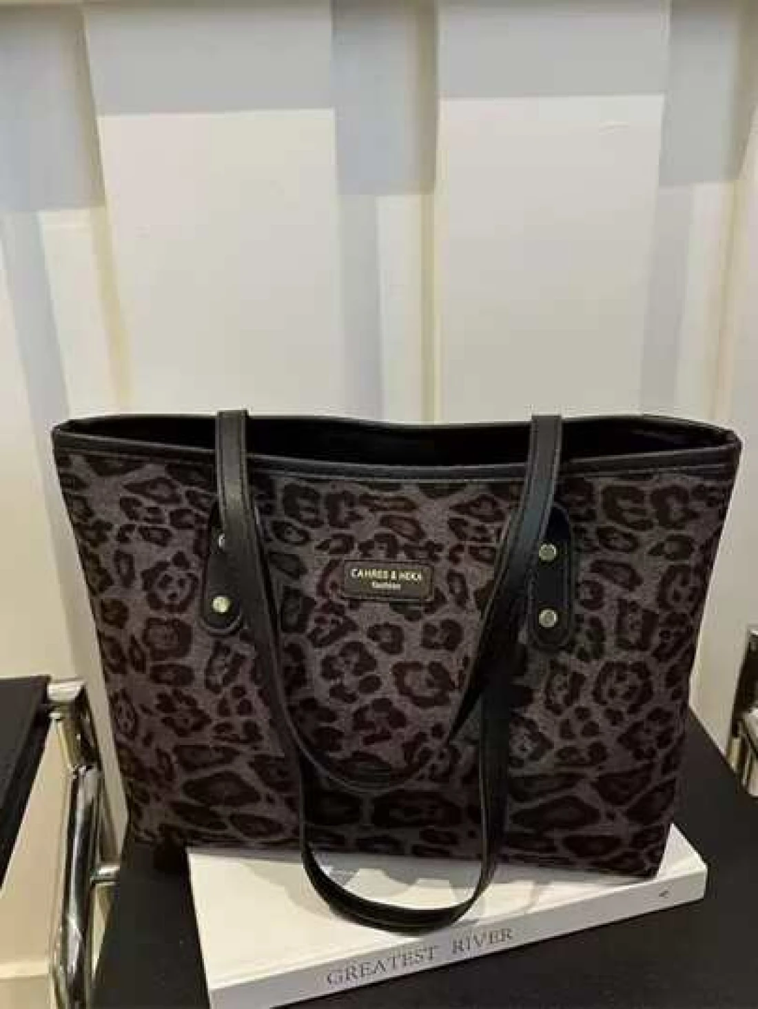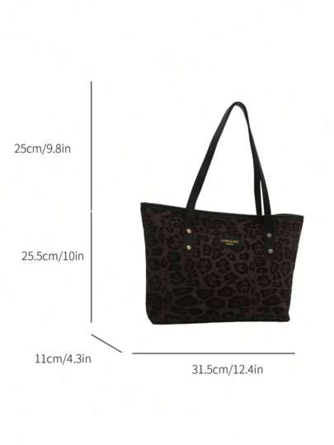 حقيبة كتف كبيرة السعة متعددة الاستخدامات مطبوعة بنمط نمر للنساء، باللون البني الداكن، مزودة برباط وحلقات معد