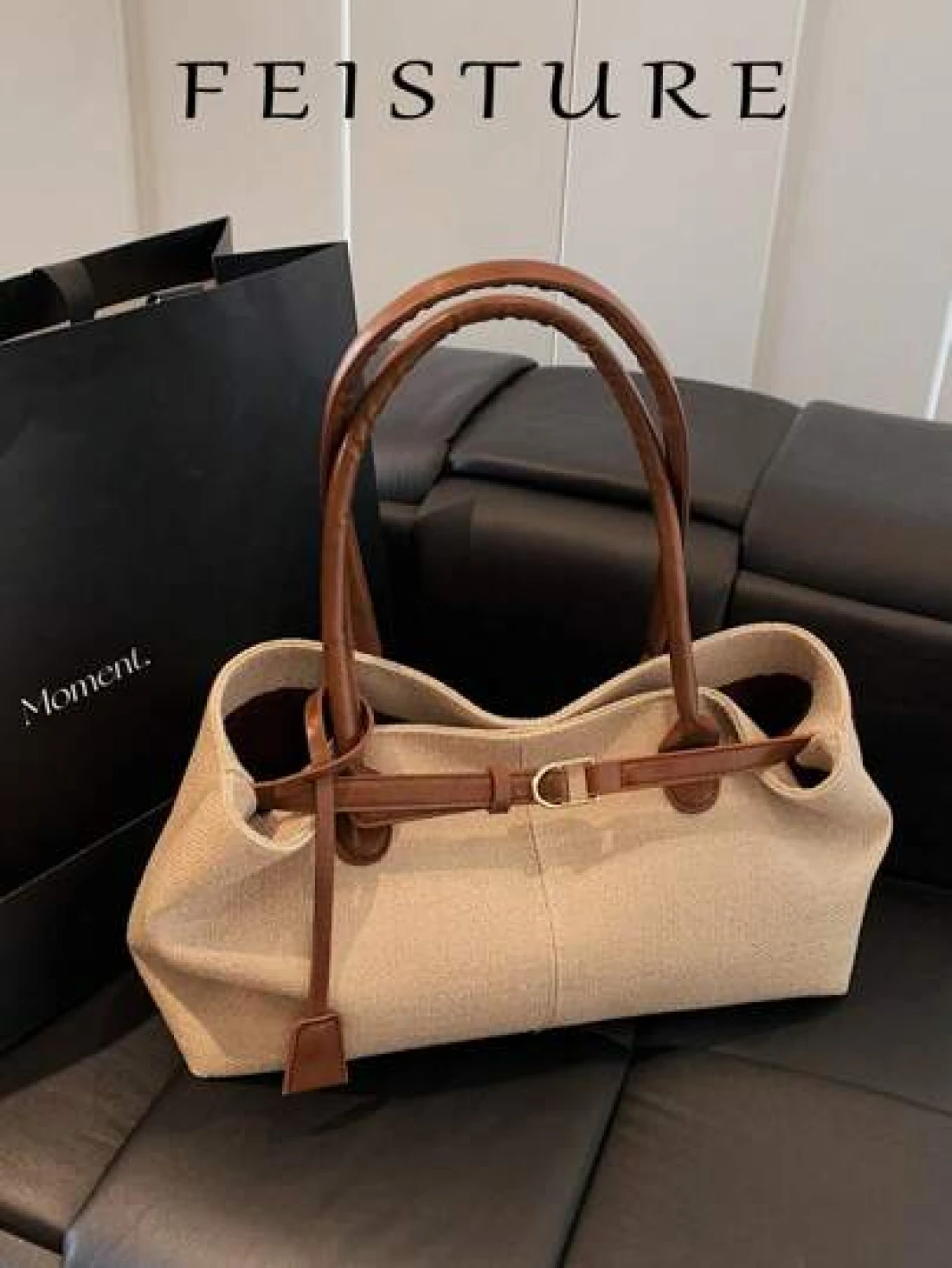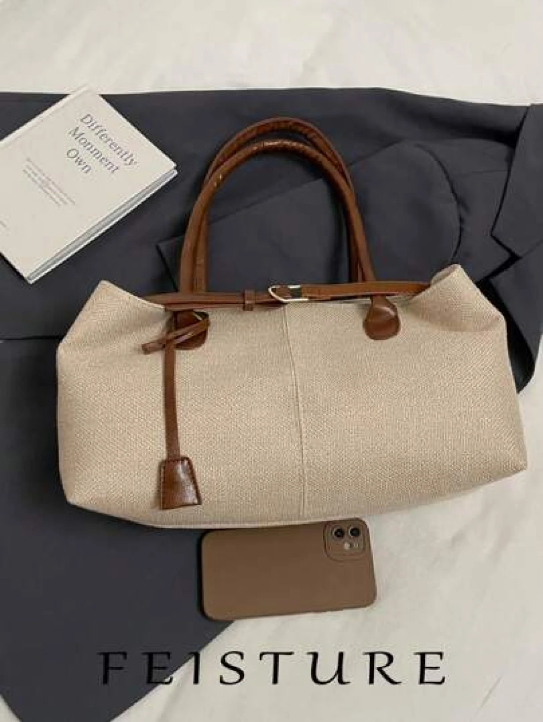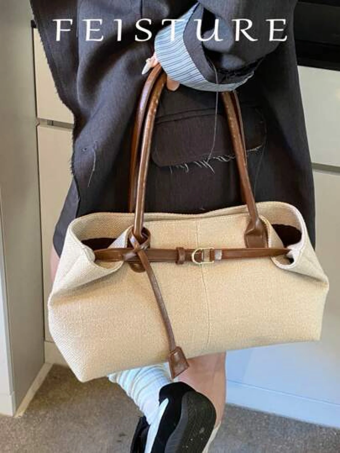 قطعة واحدة من حقيبة اليد المنسوجة من القش الصيفية من علامة FEISTURE، حقيبة على الشاطئ، تصميم حزام مع إبزيم كبير ال