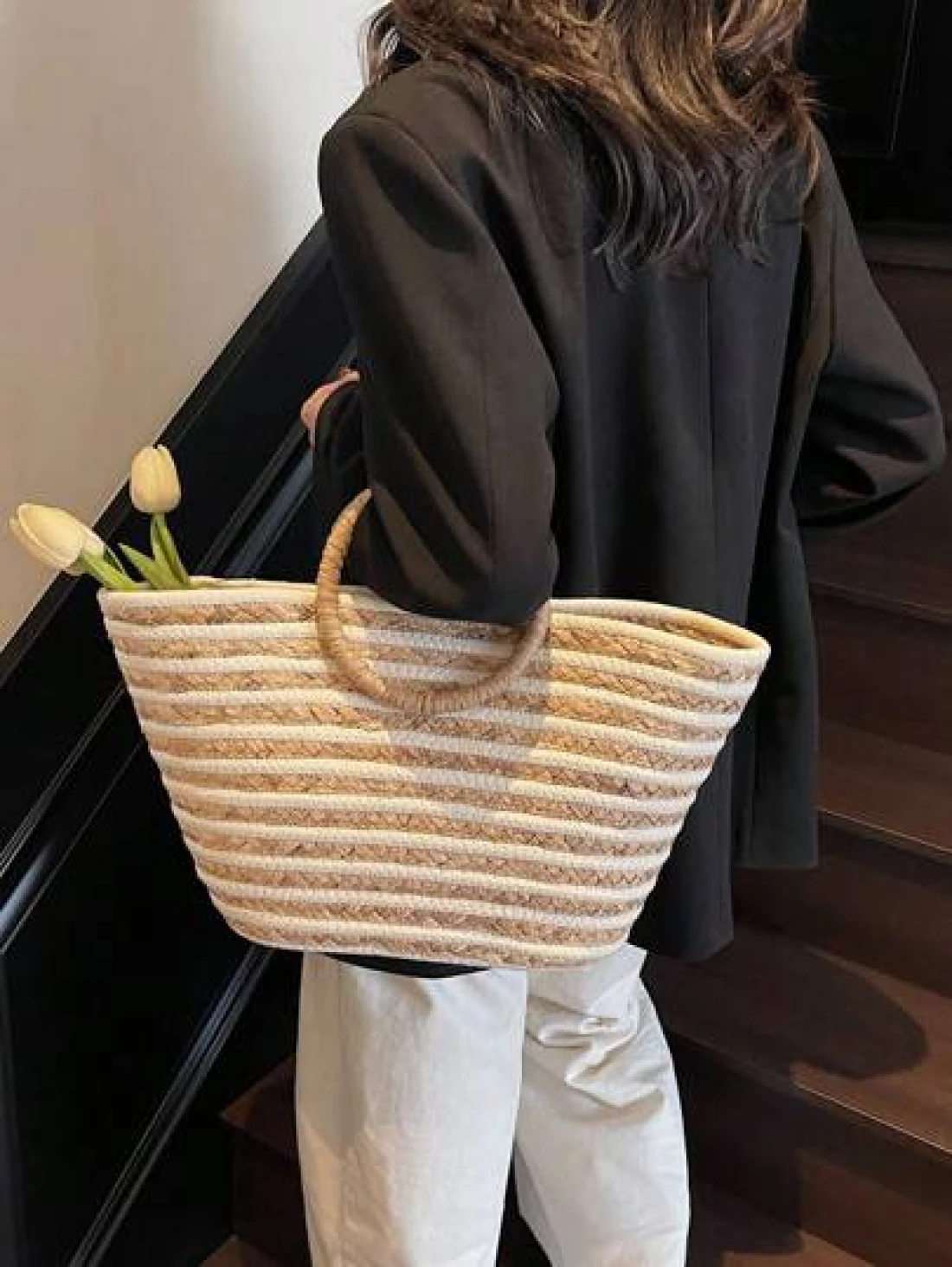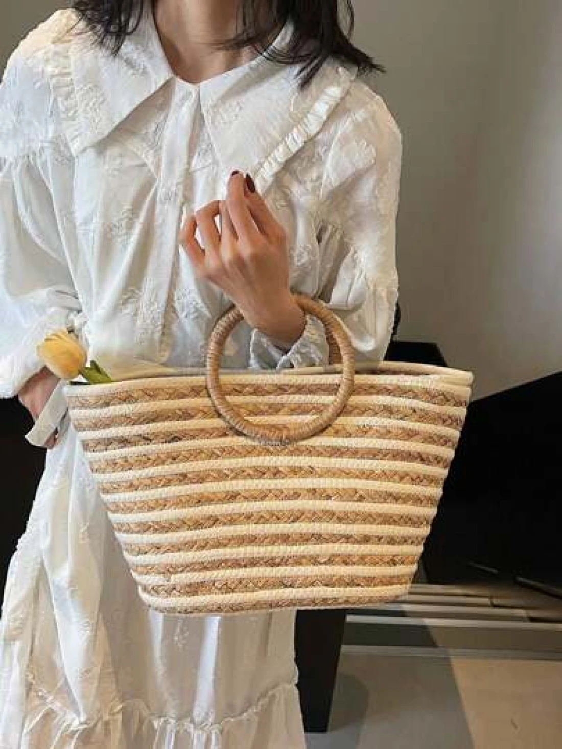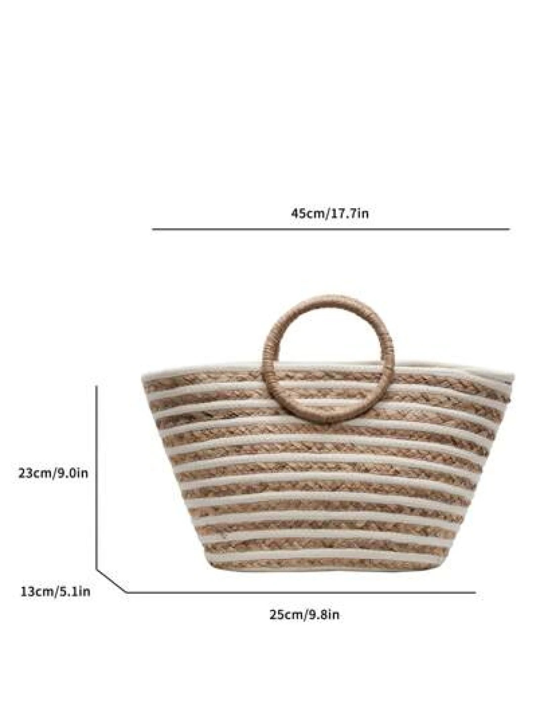 حقيبة قش كبيرة السعة ذات استخدام متعدد للنساء بمقبض دائري مخطط، حقيبة تسوق وشاطئ مناسبة للعطلات والسفر