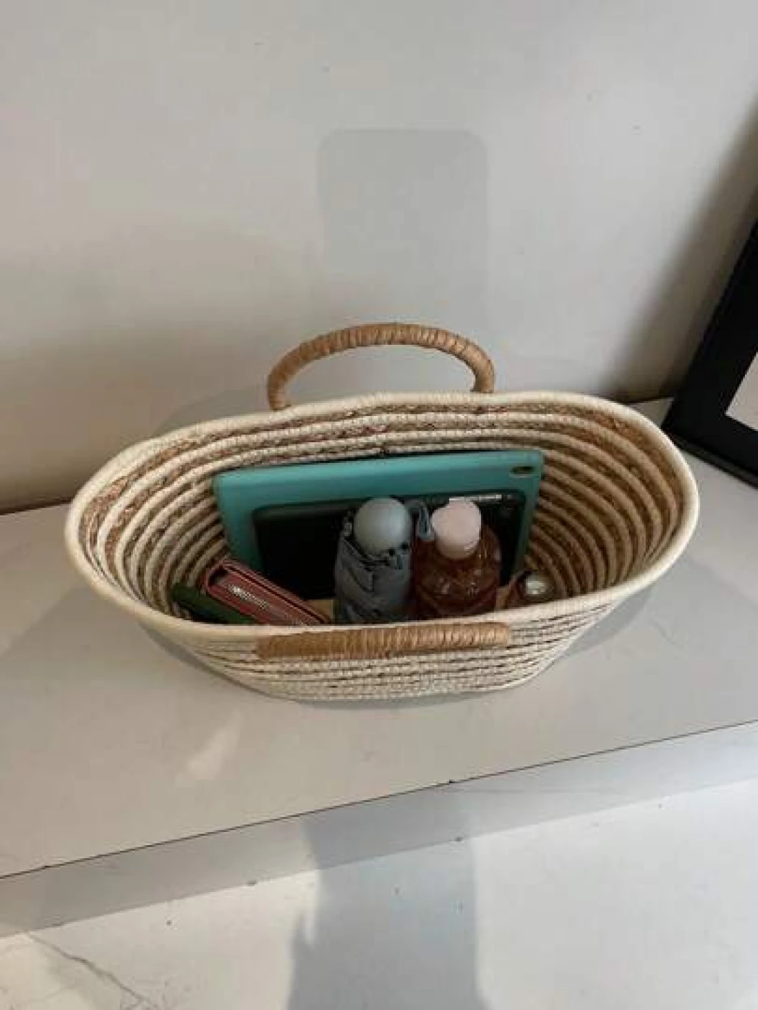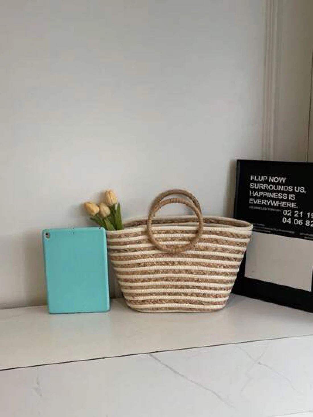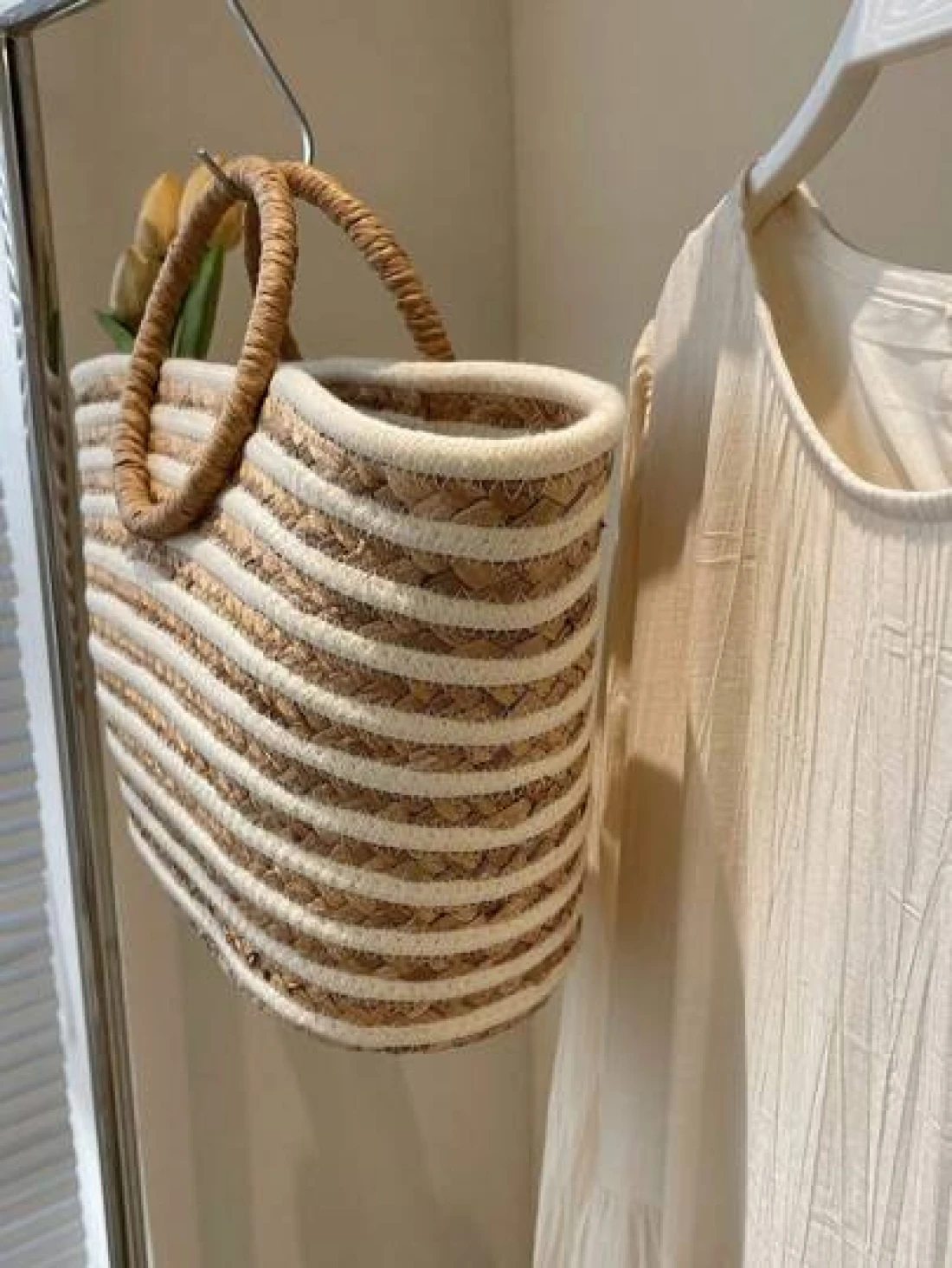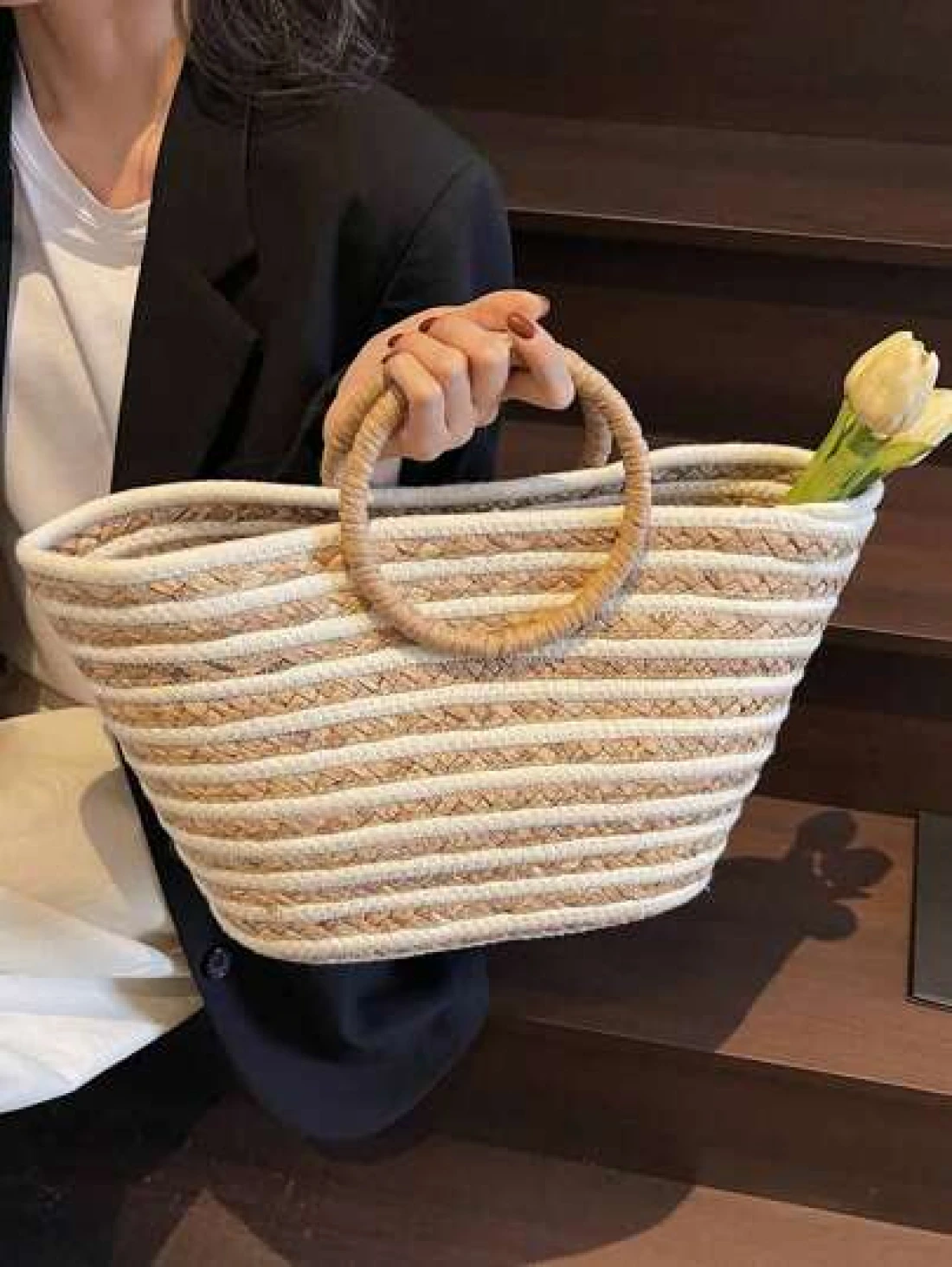 حقيبة قش كبيرة السعة ذات استخدام متعدد للنساء بمقبض دائري مخطط، حقيبة تسوق وشاطئ مناسبة للعطلات والسفر