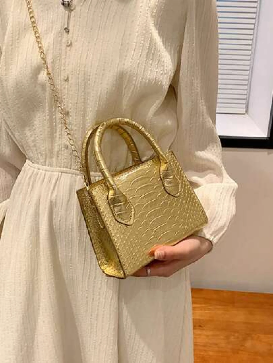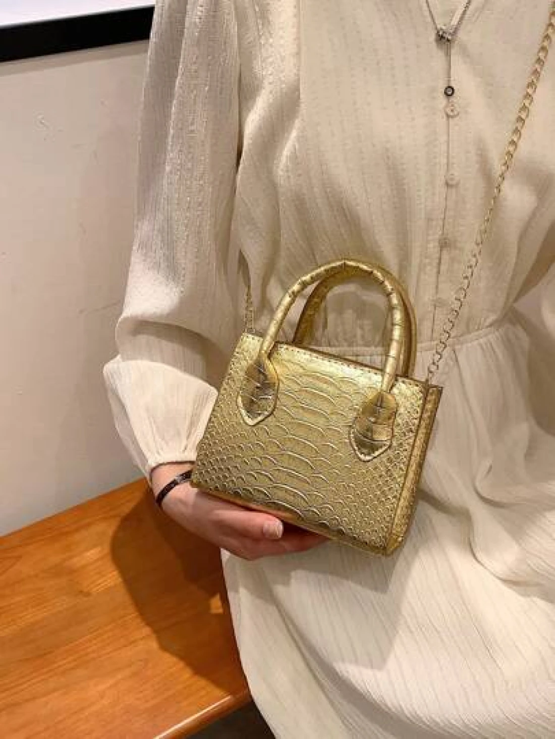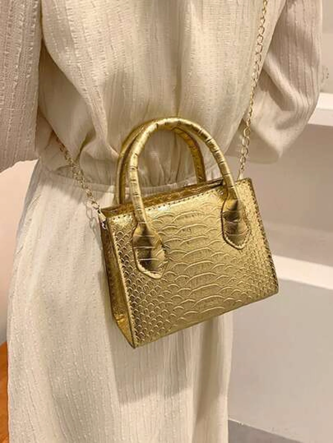 حقيبة يد بنمط جلد الثعبان المعدني من البولي يوريثان ذات بنية الأنسجة