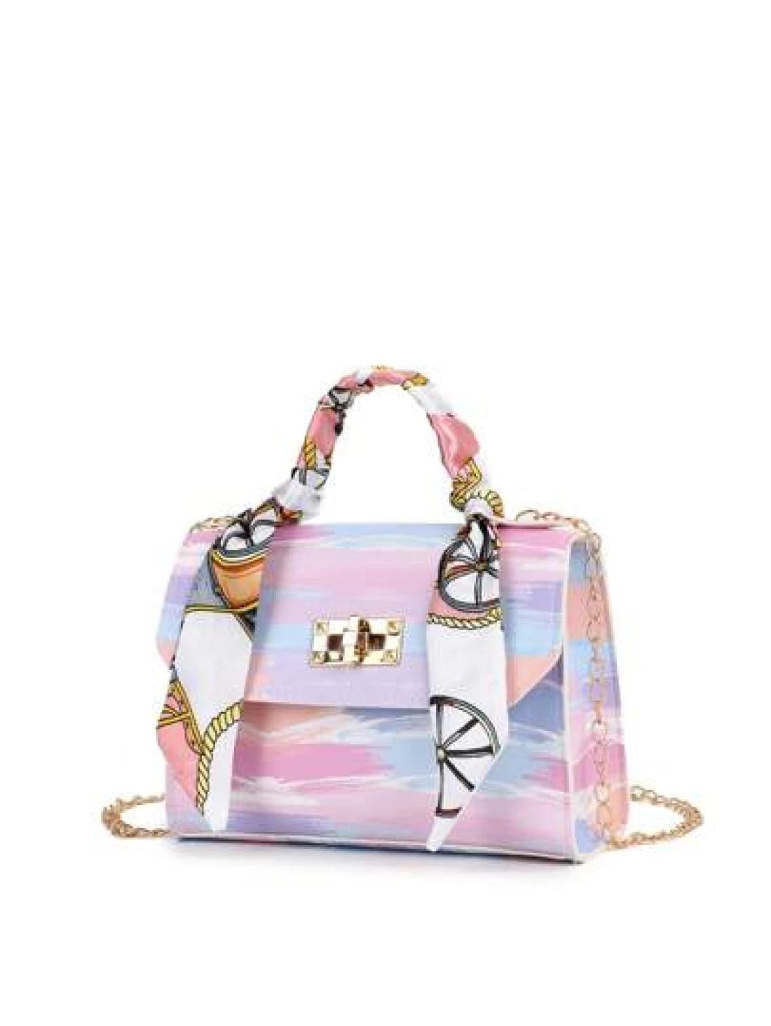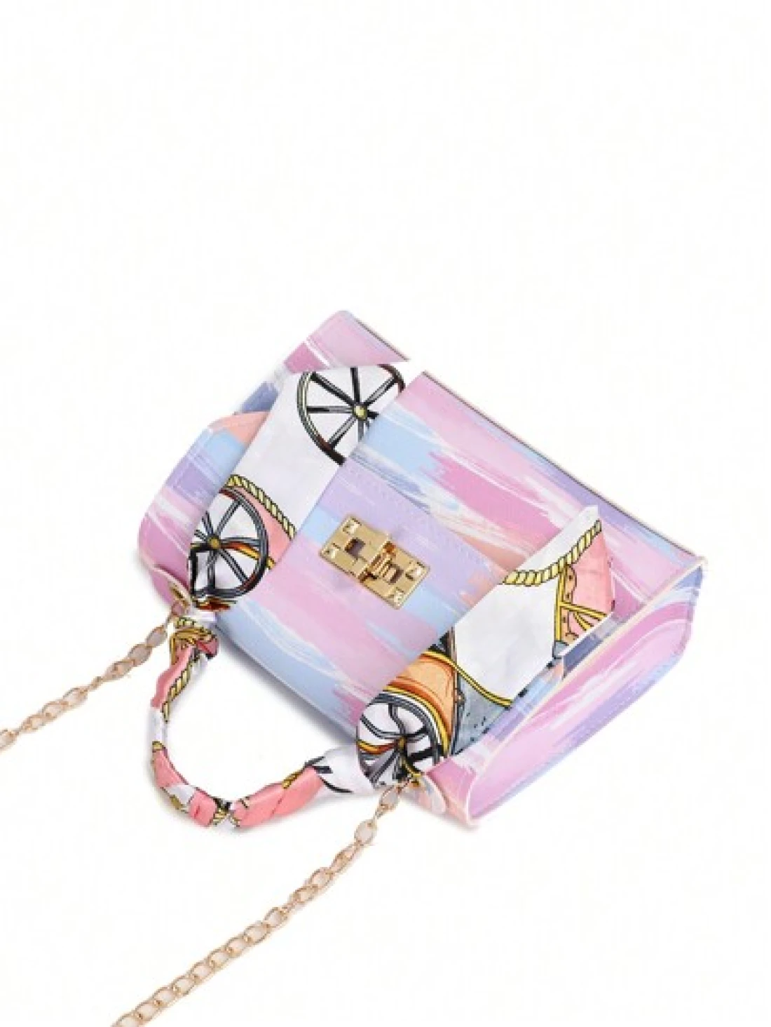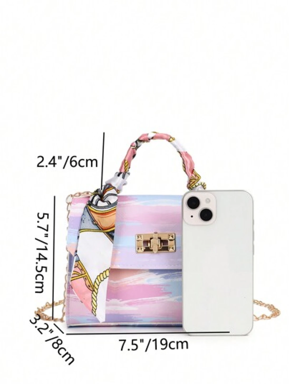 حقيبة يد بطية ومقبض سلسلة مع زخرفة حريرية بطبعة مضغوطة